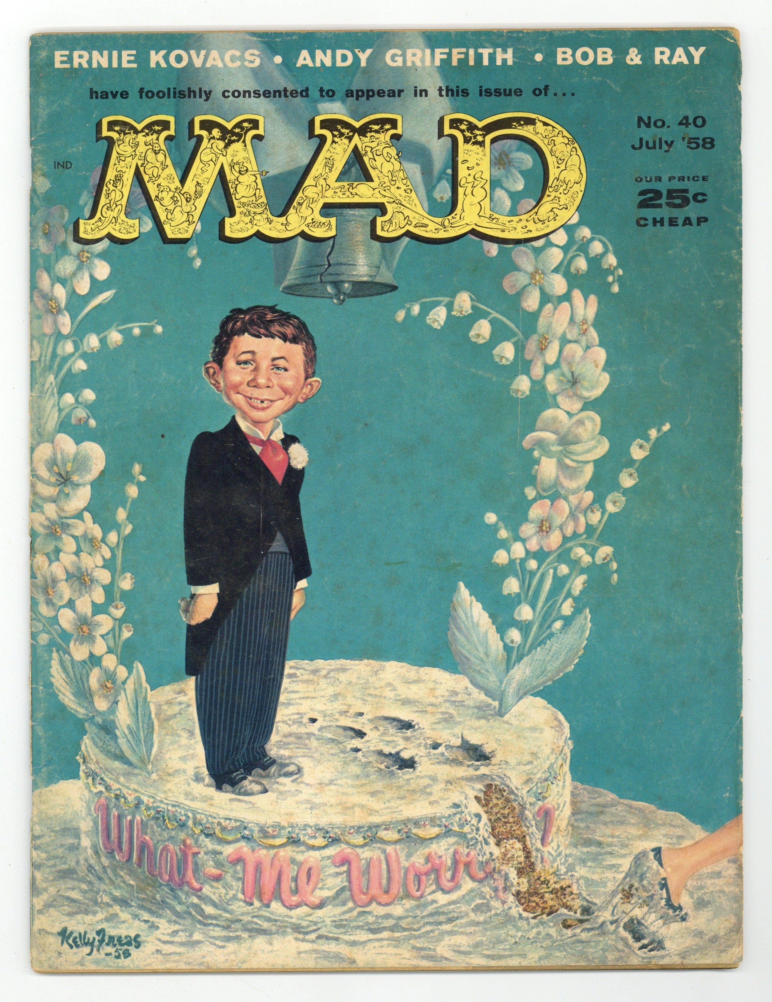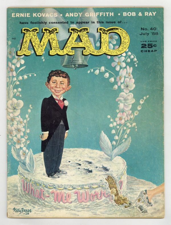 $25.50Painted cover art by Kelly Freas. "Initials That Describe The Name," script by Frank Jacobs, art by George Woodbridge; A look at the future overuse of acronyms. MAD Jewelry ad. "Pizza Pie," script and art by Dave Berg; All the problems associated with pizzas, the new national dish. "The Paper-Pickers," script and art by Don Martin; The fate of a park maintenance person who shows off his skills at picking up litter. "Ecccchhh, Teen-Age Son of Thing," art by Wally Wood; The Doctor hypnotizes an average teenager to become an Elvis Presley clone. "TV Scenes We'd Like To See," script by E. Nelson Bridwell, art by Joe Orlando; Scenes from the following TV shows with unusual outcomes: People Are Funny; The Loretta Young Show; I've Got A Secret; Anacin commercial; Mickey Mouse Club; The Lone Ranger; The Lineup. "Inside Story," art by Basil Wolverton; Stomach shapes of celebrities, based on their lives. "Pravda," script by Frank Jacobs, art by Wally Wood; Parody of the Soviet Union's Pravda newspaper. "The Cold Cereal War," script by Bob Elliott and Ray Goulding, art by Mort Drucker; A look at applying military strategy to creating cereal premiums. "The Bear Hunter," script and art by Don Martin; A man uses every weapon he has while being chased by a bear. "Future Of-The-Month Clubs," script by Frank Jacobs, art by Bob Clarke; A look at some possible future clubs inspired by Book-Of-The-Month type clubs. "Coast-To-Coast For $16.75," script by Frank Jacobs, art by Wally Wood; An account of a cross-country trip booked by MAD using unconventional conveyances. "What It Was, Was Football," script by Andy Griffith, art by George Woodbridge; An illustrated version of the comedy routine. Parody of Salem Cigarettes ad, art by Kelly Freas. 52 pgs., B&W. Cover price $0.25.