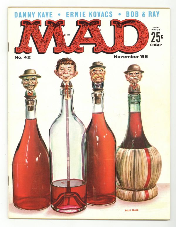 Painted cover art by Kelly Freas. "What If You Did What They Told You On TV?", script by Dee Caruso and Bill Levine, art by Bob Clarke; How doing the things that tv commercials suggest will not get the results you expect. "MAD's 1958 Pigskin Preview," script by Tom Koch, art by George Woodbridge; Parody of magazine college football season previews, along with fake definitions of football terms. "A Nameless Story," script and art by Don Martin; A boy saves a bird from a hunter...then eats the bird. "Big Cars," script and art by Dave Berg; Solutions to parking and congestion problems caused by big cars. "I'm Five!", script by Milton Schafer and Danny Kaye, art by Wally Wood; Song lyrics as performed by Danny Kaye, with illustrations. "Not-So-Far-From-Wrong Spelling Errors," script by Julius Rothenberg, art by George Woodbridge. "Not-So-Far-From-Wrong Spelling Errors," script by Julius Rothenberg, art by George Woodbridge; Parodies of children's books but on adult subjects, written and illustrated in the style of Golden Books. "Sick Sick Sick," script and art by Jules Feiffer. "Credits For The Common Man," script by Paul Laikin, art by Wally Wood; Everyday occupations with credits for all the people who helped in the background, in the style of movie credits. "Baseball Report," script by Bob Elliott and Ray Goulding, art by Mort Drucker; Wally interviews the official team heckler for the San Francisco Giants. "Scenes We Never Got To See," script by Albert Meglin, art by Wally Wood; The supposed final frame cut from famous movie scenes. Parody of Miss Clairol hair coloring ad, art by Kelly Freas. 52 pgs., B&W. Cover price $0.25.