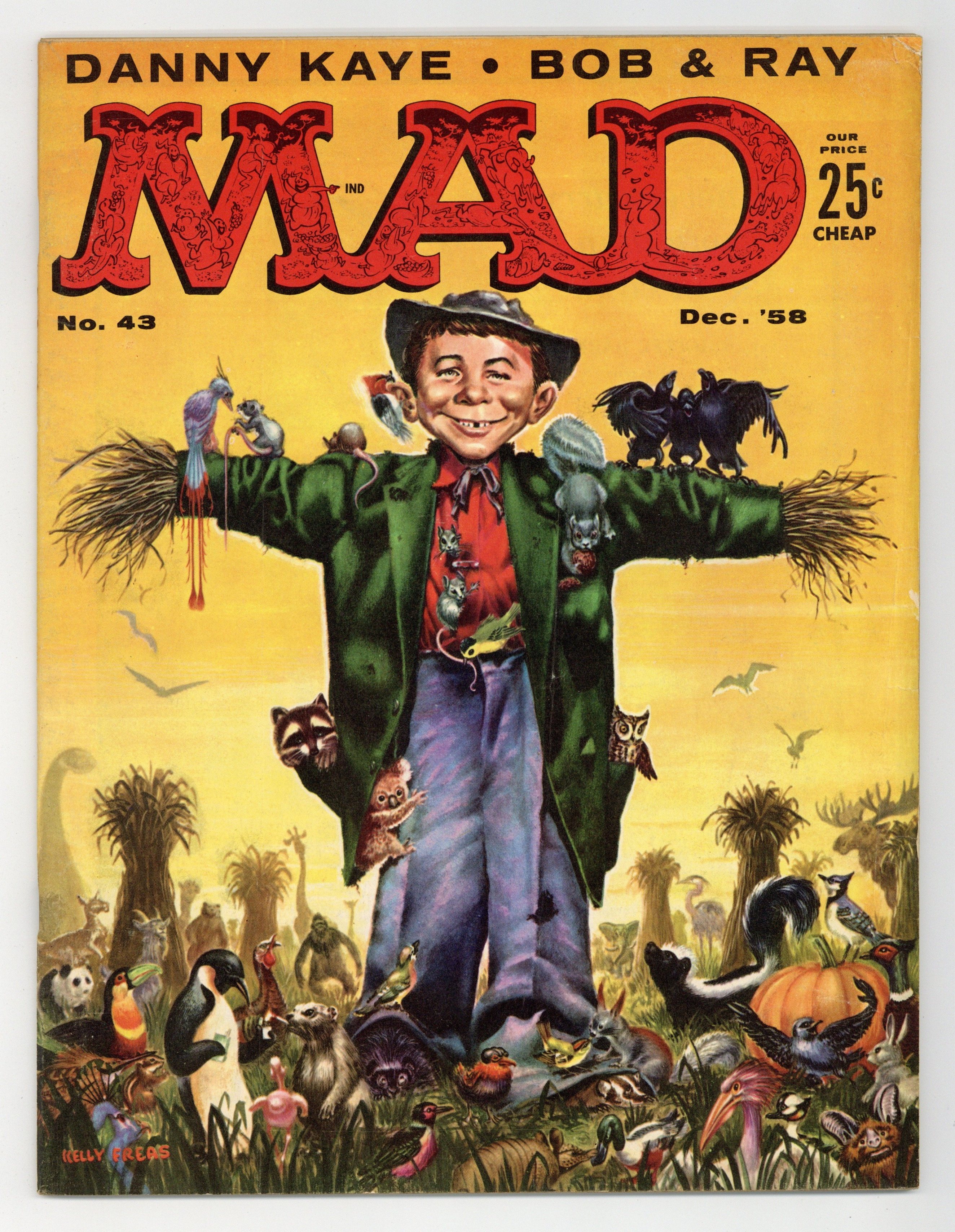 $18.00Cover art by Kelly Freas. Parody of American Express Travelers Cheques ads, , art by Kelly Freas. "MAD's M.V.B.T.A. Awards," script by Larry Siegel, art by George Woodbridge; Acting awards for baseball players hamming it up for fans and the camera during games. "The End of Comics," script by Tom Koch, art by Wally Wood; Possible final strips for when newspapers have to eliminate comics to use the space for more educational features. "Scenes We'd Like To See: The Frogmen," art by Joe Orlando. "The Electricians," script and art by Don Martin; Two building maintenance men try to find why a toaster won't work. "If Hollywood Directors Staged...Advertising Photos," art by Wally Wood; Parodies of ads depicted in the styles of directors: Alfred Hitchcock; Elia Kazan; Cecil B. DeMille; Sam Katzman. "Pushcarts," script and art by Dave Berg; History of merchandising by pushcarts and projection to a future where stores are so large that vendors sell by pushcarts within the stores. "The MAD Halloween Trick-Or-Treatment," script by Frank Jacobs, art by Mort Drucker; A list of revenges against common Halloween pranks. "The MAD Treasury of Unknown Poetry," script by Tom Koch, art by Joe Orlando. "The New Baby," script by Milton Schafer and Danny Kaye, art by Wally Wood; Song lyrics as performed by Danny Kaye, with illustrations. "Music Report," script by Bob Elliott and Ray Goulding, art by Mort Drucker; Wally interviews a man who tests the truth of song lyrics and watches him demonstrate "It's a treat to beat your feet in the Mississippi Mud." "Woodlore," art by George Woodbridge; A guidebook to (phony) dangerous plants and animals of the woods. Parody of ad for Crest Toothpaste, with painting signed as "Norman Rocknroll," art by Kelly Freas. 52 pgs., B&W. Cover price $0.25.
