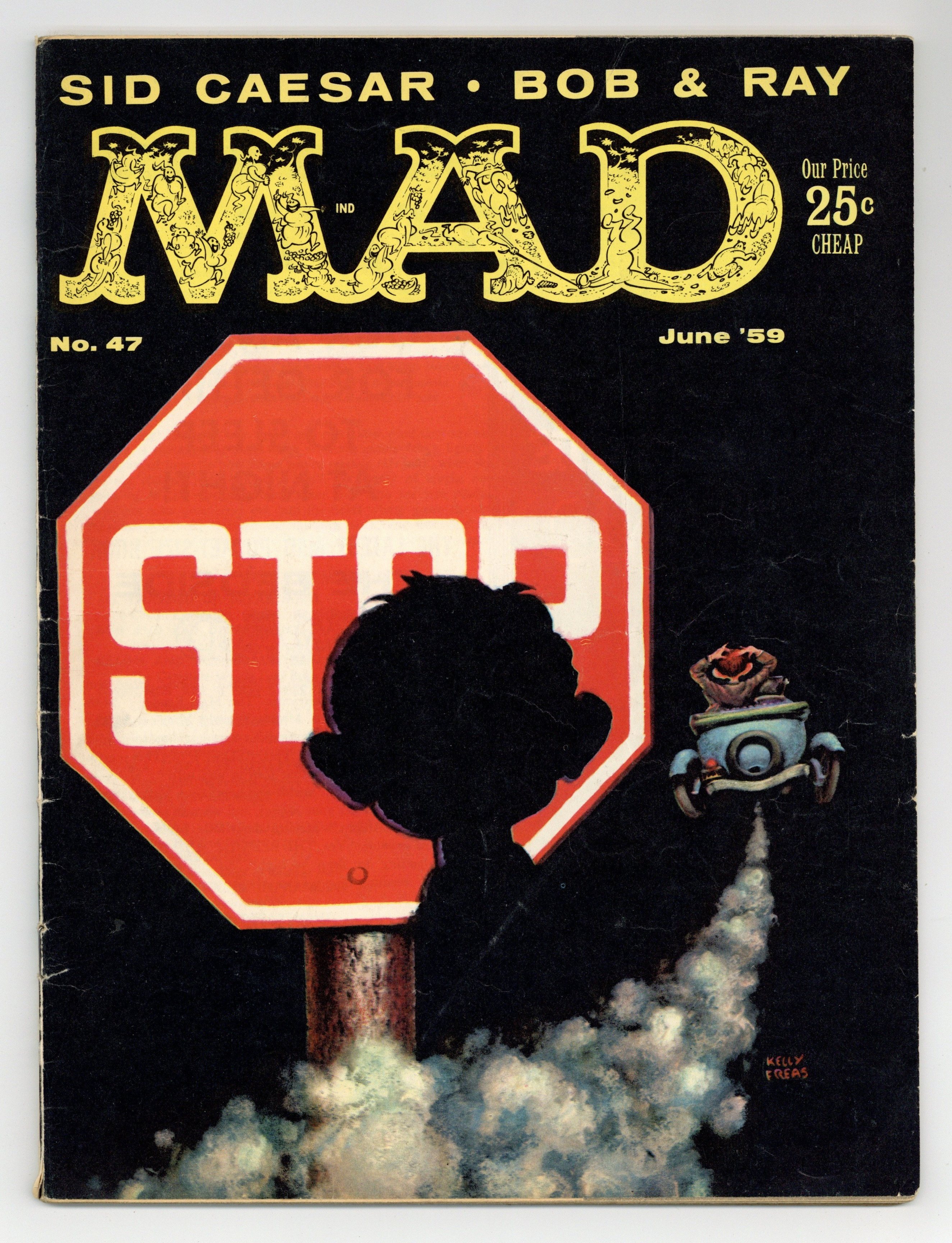 $33.00Cover art by Kelly Freas. "Combined Television Shows," script by Paul Laikin, art by Mort Drucker; Explores combinations of 2 TV shows into one, with disastrous results. "Mother's Day Cards From Special People," script by Frank Jacobs, art by Bob Clarke. "It Happened On The Crosstown Bus," script and art by Don Martin; A man is attacked in an unusual way. "How To Be A MAD Non-Conformist," script by Sy Reit, art by George Woodbridge. "Little League," script and art by Dave Berg; The future of kids' baseball as Little League becomes ever more organized. "The Battle of The Credit Cards," script by Al Jaffee, art by Bob Clarke; Unlikely businesses that you can charge and a journal of how credit cards work for business expenses. "The Professor Lectures On Space," script by Sid Caesar, art by Wally Wood; The professor gives an incoherent lecture, concerned more about situations on earth than in space. "Jack And Jill As Retold By Various Magazines," script by Paul Laikin, art by Joe Orlando; The nursery rhyme retold as tales of romance, adventure and crime. "Future Halls Of Fame," script by Frank Jacobs, art by George Woodbridge; Inductees into various Halls of Fame we might see, if the trend of establishing these for just about any occupation or hobby in sight continues. "The Greatest Missile Ever Built," script by Al Jaffee, art by Wally Wood; Detailing the need for and design of an undetectable missile weapon. "Pressure Can Report," script by Bob Elliott and Ray Goulding, art by Mort Drucker; Fenwick shows us how stuff and air are put into aerosol spray cans and previews some new spray products. "First Aid Handbook," script by Frank Jacobs, art by Wally Wood; Bad advice on how to treat common injuries, including how to cause them. Phony ad for dressmakers' colored tissue paper; parody of Scott Tissue ad, art by Kelly Freas. 52 pgs., B&W. Cover price $0.25.