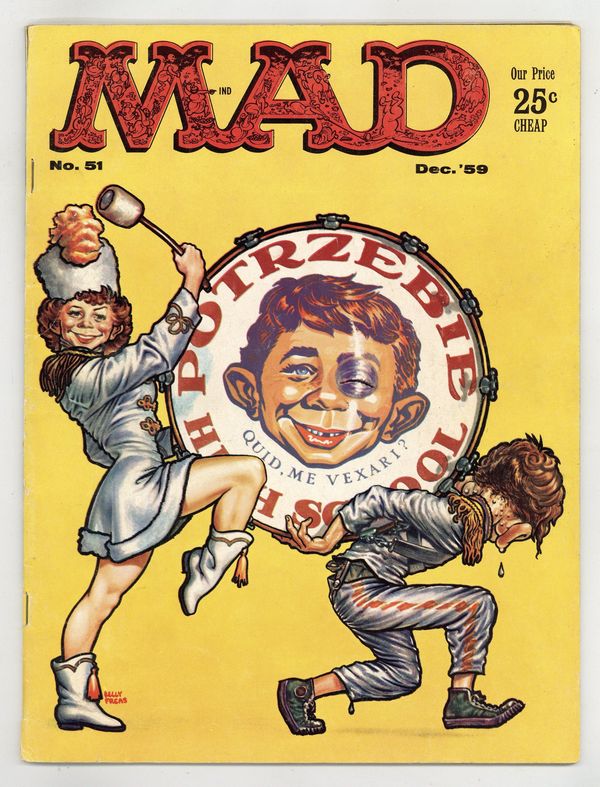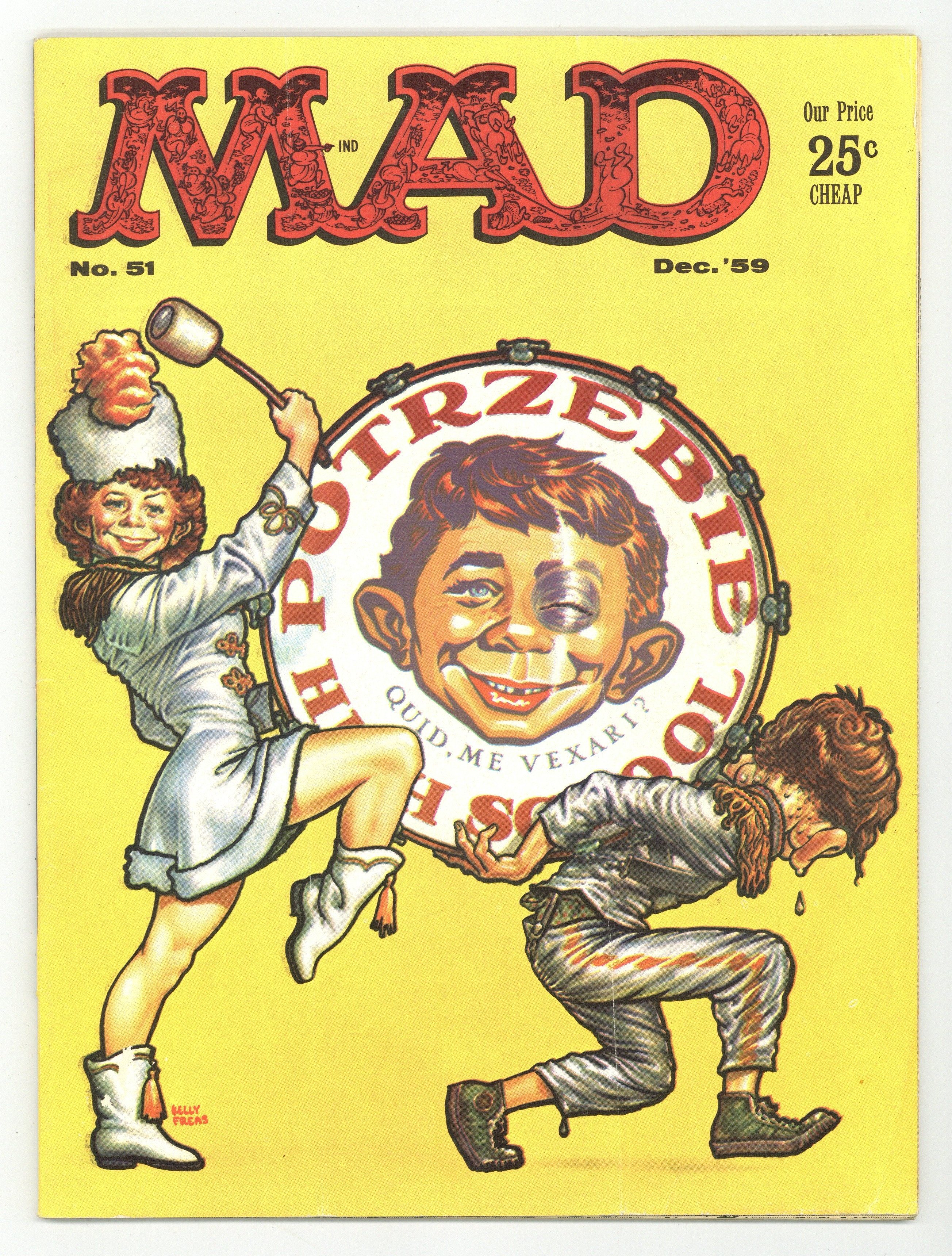 $17.50Cover art by Kelly Freas. Satire on Hanes underwear ads, art by Kelly Freas. "Advertising Slogans Will Replace Everyday Conversations," script by Frank Jacobs, art by Wallace Wood; Shows how advertising slogans can be used in many different situations to replace ordinary conversation. "The Man With The Sprung Neck," script and art by Don Martin; A man with his neck out of place visits two doctors, who end up winding him up like a toy top. "The Night The Price Is All Right Has An Unexpected Guest," script by Larry Siegel, art by Mort Drucker; Parody of the TV show "The Price Is Right", in which an uncharacteristically unexcited guest nearly ruins the show. "A MAD Treasury of Unknown Poetry Volume 2," script by Tom Koch, art by Joe Orlando; Parodies of famous poems by Edgar Allan Poe, Rudyard Kipling and others. "Testing Civilians For Space Flight," script by Al Jaffee, art by Wallace Wood; Testing the theory that the most difficult part of long space flights for people to deal with is withdrawal from their usual patterns of life, researchers discover an even bigger problem. "MAD Looks At Adult Education," script by Paul Laikin, art by George Woodbridge; Parody of course offerings at adult schools, featuring the more practical offerings in the Course Bulletin for Potrzebie High School Division of Adult Education. "Hide-A-Bed," script and art by Dave Berg; The concept of a bed that folds out from a sofa or chair is extended to place beds in other items of furniture, and then to other items besides beds being folded up. "Madison Avenue Turns To History And Literature," script by Larry Siegel, art by Bob Clarke; Parodies of various magazine ads using history or literature as motifs. "Grandstand Football," script by Frank Jacobs, art by George Woodbridge; Discussion of the actions of the spectators in the stands during a football game, as if they are playing a game. "Teenage," script by Larry Siegel, art by Joe Orlando; Parody of magazines targeted towards teenagers. Son of MAD ad. 52 pgs., B&W. Cover price $0.25.