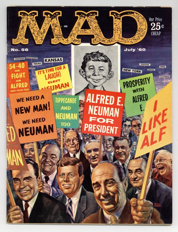 Cover art by Kelly Freas. Parody of ad for a coffee growers organization, script by Al Jaffee, art by Kelly Freas. Alfred E. Neuman bust ad. "Madison Avenue's Political Ad Campaigns," script by Gary Belkin, art by George Woodbridge; Parodies of consumer product ads used as political ads. "MAD's Modern Olympic Games," script by Tom Koch, art by Mort Drucker; Olympic style events based on the skills of living modern city life. "MAD Bubble Gum Cards," script by Tom Koch, art by Joe Orlando; What bubble gum card statistics might look like if the cards featured people from professions other than sports. "The MAD Comic Opera," script by Frank Jacobs, art by Wallace Wood; A parody of Broadway musicals using comic strip characters; Rex Morgan has kidnapped Annie and intends to remove her unique eyes, but Sandy leads Dick Tracy and Tarzan to a rescue, which is aided by Snuffy Smith. "Honest Ads," script by Tom Koch, art by Bob Clarke. "Patty Play Dolls," script and art by Dave Berg; Details the expenses of owning a doll as big as a child, and advises parents to ask Congress to declare such dolls as dependents so the parents can get a tax break. "MAD's TV Alfie Awards," script by Sy Reit, art by Mort Drucker; TV stars receive awards for categories of dubious merit, in a parody of the Emmy Awards show. "The U.S. Army Chicken Officer's Field Manual," script by Larry Siegel, art by Bob Clarke; A phoney instruction book for army officers, showing how they are trained in all the things that annoy enlisted men. Parody of a series of Johnny Walker liquor ads, art by Kelly Freas. 52 pgs., B&W. Cover price $0.25.