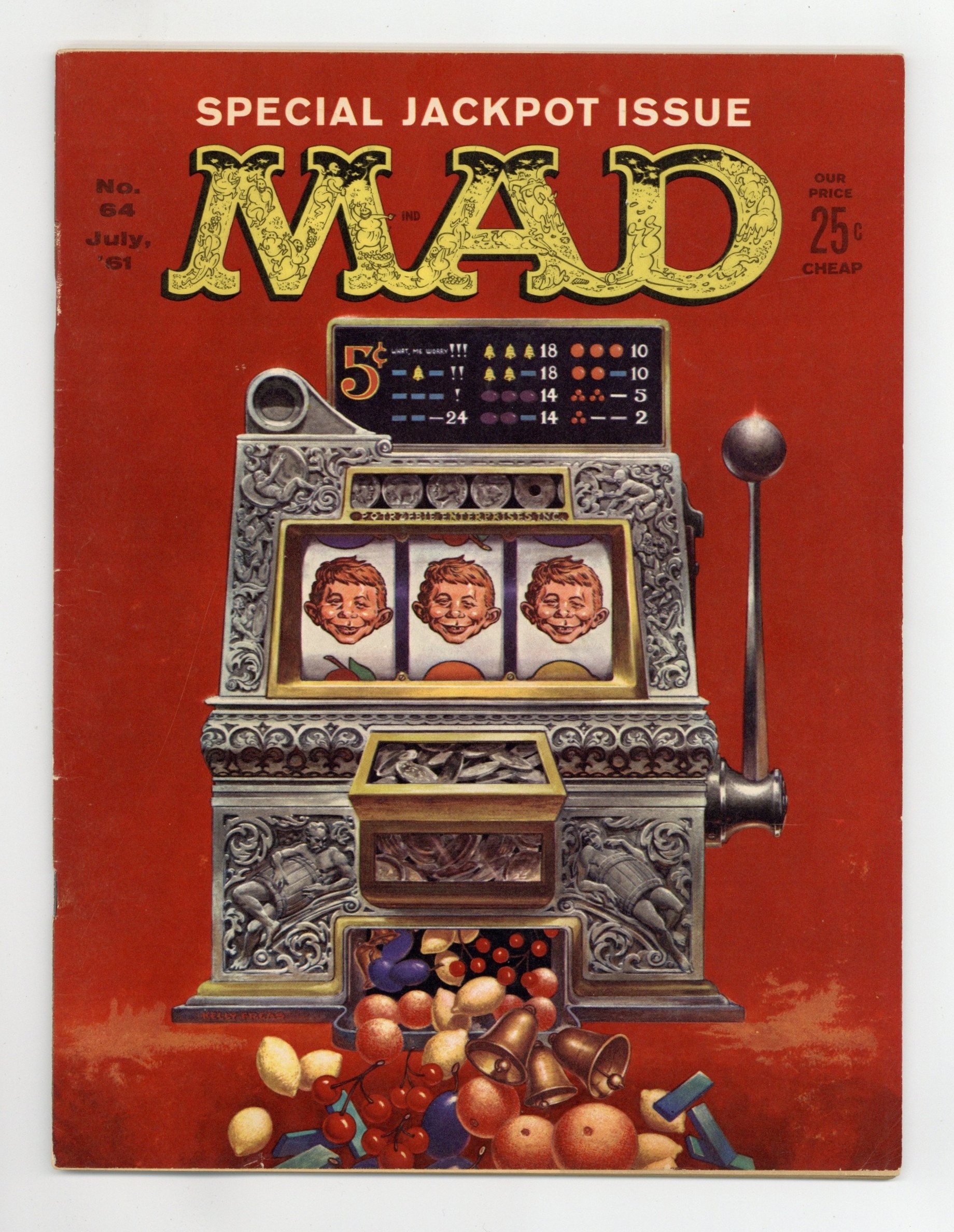 $14.25Cover art by Kelly Freas. "If There'd Been a Madison Ave. Down Through History," script by Sy Reit, art by Bob Clarke; Ad campaigns based on historical items. "A Mad Look at the Telephone," script and art by Dave Berg; A series of phone-related gags. "Scenes We'd Like to See," script by Al Jaffee, art by Mort Drucker. "The Mad Treasury of Unknown Poetry," script by Tom Koch, art by George Woodbridge; Parody of famous poems. "A Young Man's Ambition," script and art by Don Martin. "A Mad Guide For Baby Sitters," script by Al Jaffee, art by Bob Clarke; Satirical how-to guide for choosing the best baby sitter. "Spy Vs. Spy," script and art by Antonio Prohias; The White Spy tries to ambush the Black Spy by dressing in a cat costume. "The Daily Square," script by Larry Siegel, art by Joe Orlando; A newspaper geared to the tragically unhip. "The Business of Baseball," script by Frank Jacobs, art by George Woodbridge; Examples of how professional baseball has changed in sixty years. "The Typical Summer Resort Ad," script by Larry Siegel, art by Joe Orlando; Examples of deceptive advertising for summer resorts. "Sneaky Camera," script by Tom Koch, art by Jack Rickard; Parody of the television show "Candid Camera." "In the Doctor's Office," script and art by Don Martin. "A Career Awaits You in the Modern Army," script by Dean Norman, art by Bob Clarke; Careers you can learn while a member of the U.S. military. "Bedtime Stories As Told by Job-Conscious Fathers," script by Frank Jacobs, art by Wally Wood; Fairy tales adjusted to specific job situations by their tellers. "In the Penny Arcade," script and art by Don Martin. 52 pgs., B&W. Cover price $0.25.