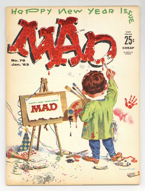 $13.50Cover art by Norman Mingo. "If Kids Designed Their Own Christmas Toys," script by Al Jaffee, art by Al Jaffee (models) and Lester Krauss (photos); Examples of plans for various toys and the actual to scale models of those same toys. "In the Doctor's Office," script and art by Don Martin. "If the U.S. Government Bought Like the U.S. Public Buys," script by Stan Hart, art by George Woodbridge; Pentagon purchasing based on advertising, coupons and volume discounts. "TV Pilot Films That Never Made It," script by Stan Hart, art by Mort Drucker; Samples of TV pilot shows that were bad ideas. "A Mad Look at the U.S. Space Effort," script and art by Sergio Aragones. "Seeing Isn't Always Believing," script by Frank Jacobs, art by Wally Wood; How news photos can be used to distort the record of various events. "The Lighter Side of Winter," script and art by Dave Berg; Series of illustrated humorous anecdotes concerning winter and winter activities. "Modern Teenage Sports," script by Arnie Kogen, art by George Woodbridge; Examples of teenage behavior modified to become sporting events. "Mad's Modern Aids to Happier Living," script by Don Reilly, art by Joe Orlando; Dubious solutions to some of the irritations of modern life. "Mad's Movie Theater Owner of the Year," script by Larry Siegel, art by Jack Rickard; A successful movie theater owner is interviewed. "In a Sicilian Restaurant," script and art by Don Martin. "Mad's Merry Christmas Happy New Year Alphabet Book," script by Frank Jacobs, art by Bob Clarke; Satirical holiday-based items for every letter of the alphabet. 52 pgs., B&W. Cover price $0.25.