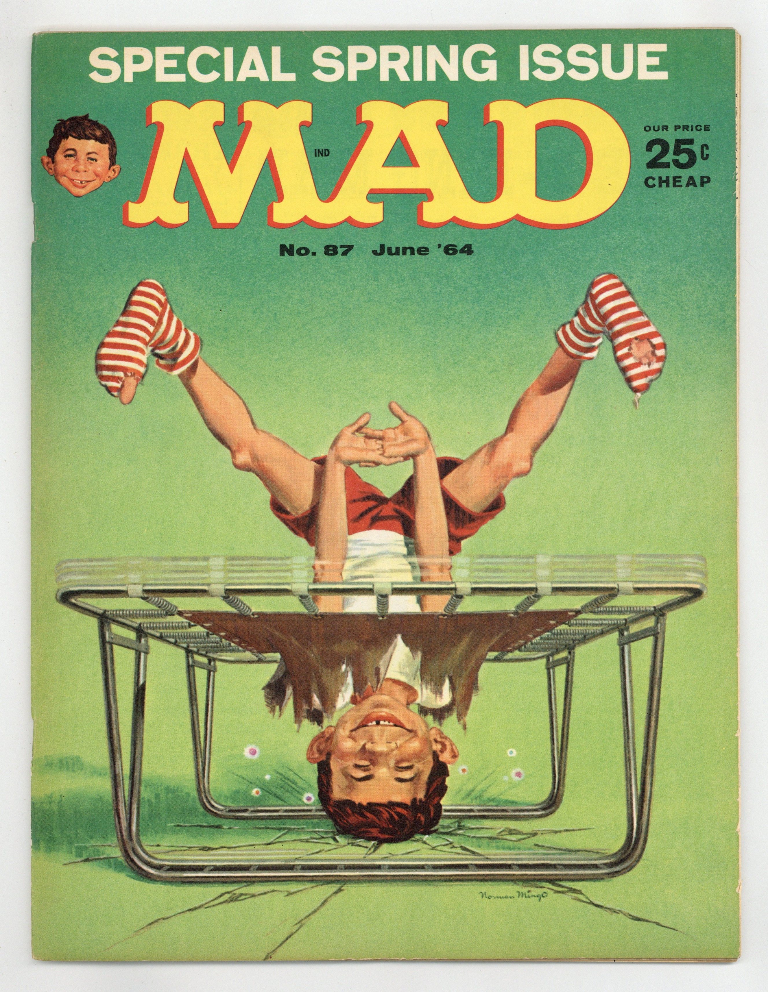 $18.00Cover art by Norman Mingo. "Kids' Versions of Adult Films," script by Stan Hart, art by Mort Drucker; Serious dramatic films sanitized and altered to appeal to a pre-teen audience. Films parodied are "Days of Wine and Roses", "The Hustler", "Irma La Douce" (with an all funny animal cast), "Never on Sunday" and "Monte Cane." "At the Mask Store," script and art by Don Martin; Merry mix-ups at a costume shop. Cartoons in the margins by Sergio Aragones. "Spy Vs. Spy," script and art by Antonio Prohias. "TV Ads We'd Like to See," art by Joe Orlando. "A Mad Look at the Circus," script and art by Sergio Aragones. "The Lighter Side of Home Owners," script and art by Dave Berg. "Pre-Recorded Phone Messages," script by Larry Siegel and Frank Jacobs, art by Mort Drucker; Answering machine messages designed to discourage certain callers. "The Electrician," script and art by Don Martin. "Angry," script by Stan Hart, art by George Woodbridge; A niche magazine for people with violent tempers. "Who Wants to Be President More than Anything" Mad Fold-In by Al Jaffee. 52 pgs., B&W. Cover price $0.25.
