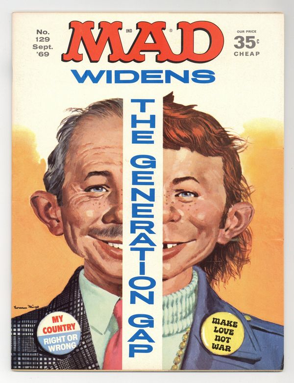 $13.50Cover art by Norman Mingo. "Don Martin Takes a Look at a Fairy Tale," script and art by Don Martin; Gruesome retelling of the story of Rapunzel. "Mad Origami Zoo of Cliche Creatures," script by Frank Jacobs, art by Guiseppe Baggi; Origami figures folded out of paper with specific images printed on the paper for ironic effect. Cartoons in the margins by Sergio Aragones. "The Brother Hoods," script by Lou Silverstone, art by Mort Drucker; An American marries into a Sicilian family, travels to Sicily in order to join the Mafia, and finds that nobody there belongs to the Mafia. "The Mad Primer of Bigots, Extremists and Other Loose Ends," script by Frank Jacobs and Stan Hart, art by Jack Davis; An examination of various political and social extremist movements, done as a children's reading primer. "The Mad Approach Toward Bridging the Generation Gap," script by Earle Dowd, art by Paul Coker Jr.; Outlining a right way and a wrong way to deal with teenage behavioral problems. "The Lighter Side of Status Seeking," script and art by Dave Berg; Satire of upwardly mobile people. "Spy Vs. Spy" by Antonio Prohias. "A Mad Look at Dogs," script and art by Sergio Aragones. "Mad Gray Paper: The State of Our Cities," script by Stan Hart, art by George Woodbridge; A television news crew does a documentary on inner city housing conditions. "Dr. Benjamin Spock Teenager Care," script by Larry Siegel, art by Bob Clarke; Advice guide on how to raise and cope with a teen. "Jewella," script by Stan Hart, art by Mort Drucker; In a parody of the TV series "Julia," a stunningly beautiful, successful nurse tries to raise her son on her own and search for a husband at the same time. "What Were the Investigations Into the "Pueblo Affair" Really Looking For?" Mad Fold-In by Al Jaffee. 52 pgs., B&W. Cover price $0.35.