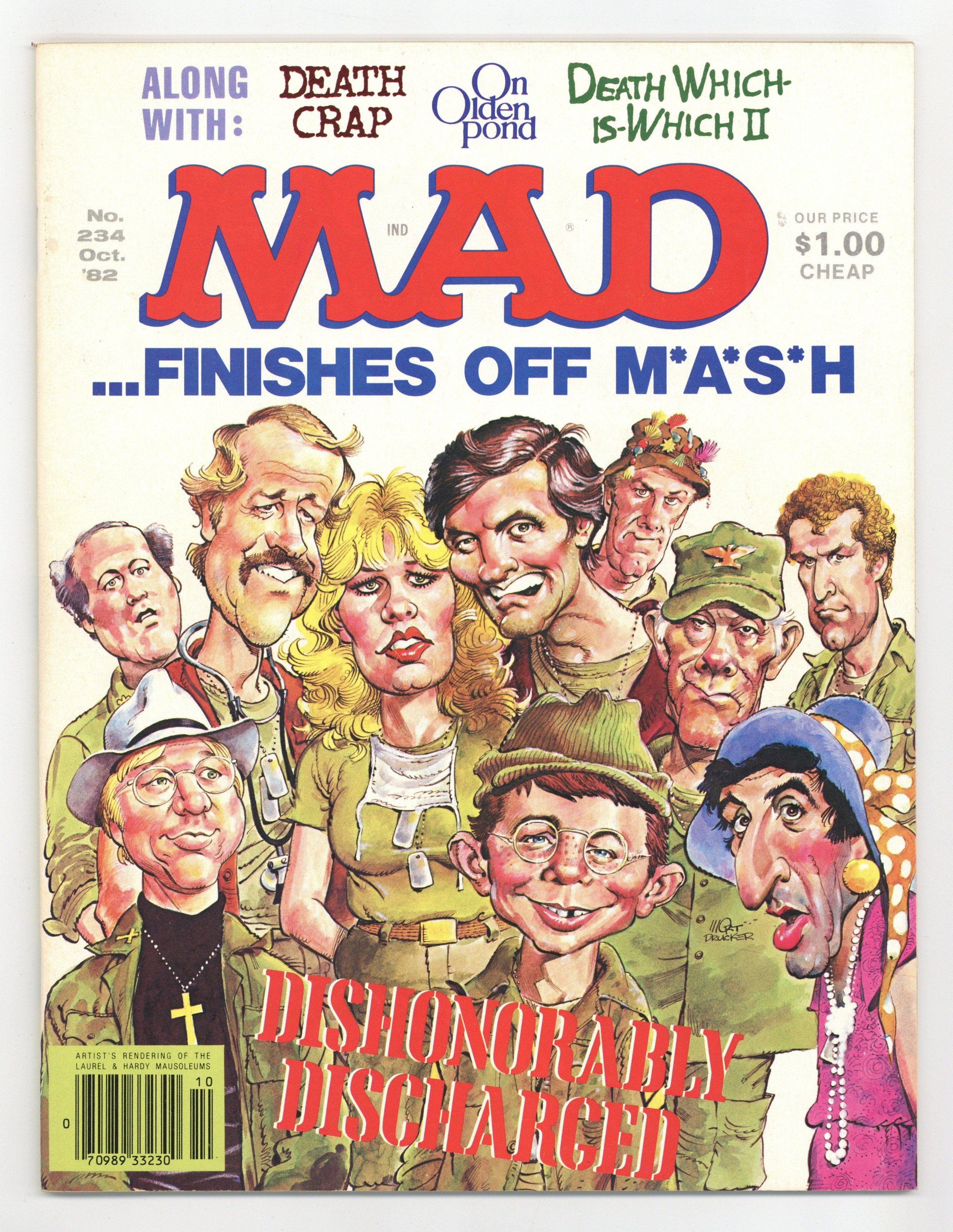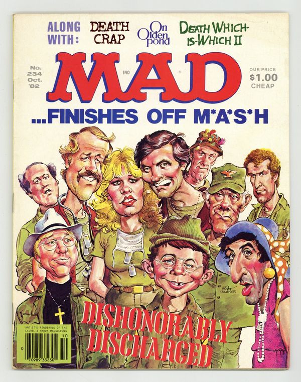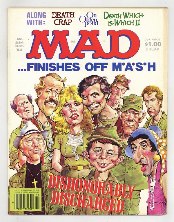 $10.00Cover art by Mott Drucker. "M*U*S*H*", script by Arnie Kogen, art by Jack Davis; In a parody of the TV series "M*A*S*H*," life is portrayed on a past-its-prime television series about the Korean War. "Marching Songs Now that the Armed Forces are Co-ed," script by Mary Joan Chini (plot) and Frank Jacobs, art by Jack Rickard; Famous military songs are rewritten to reflect modern times. "One Freezing Day in a Cemetery," script and art by Don Martin; A group of pallbearers have an accident. "The Lighter Side of ...," script and art by Dave Berg; Ironic situations inspired by people dealing with big brothers, cooking, injuries, crime, discipline, math, the other woman, economics, doctors, medical exams, dinner time, parents, dating and justice. "Mad's Theft and Vandal-Proof Products," script and art by Al Jaffee; Products designed to foil theft and vandalism attempts. "Spy Vs. Spy" by Antonio Prohias. "A Mad Look at American Justice," script by Larry Siegel, art by George Woodbridge; A satirical examination of the American Justice System from its beginnings to its current state. "A Special Edition of 20/30 Starring Barbara Waltzers," script by Dick DeBartolo, art by Mort Drucker; A journalist interview three celebrities plugging their new films. Mad Fold-In by Al Jaffee. 52 pgs., B&W. Cover price $1.00.