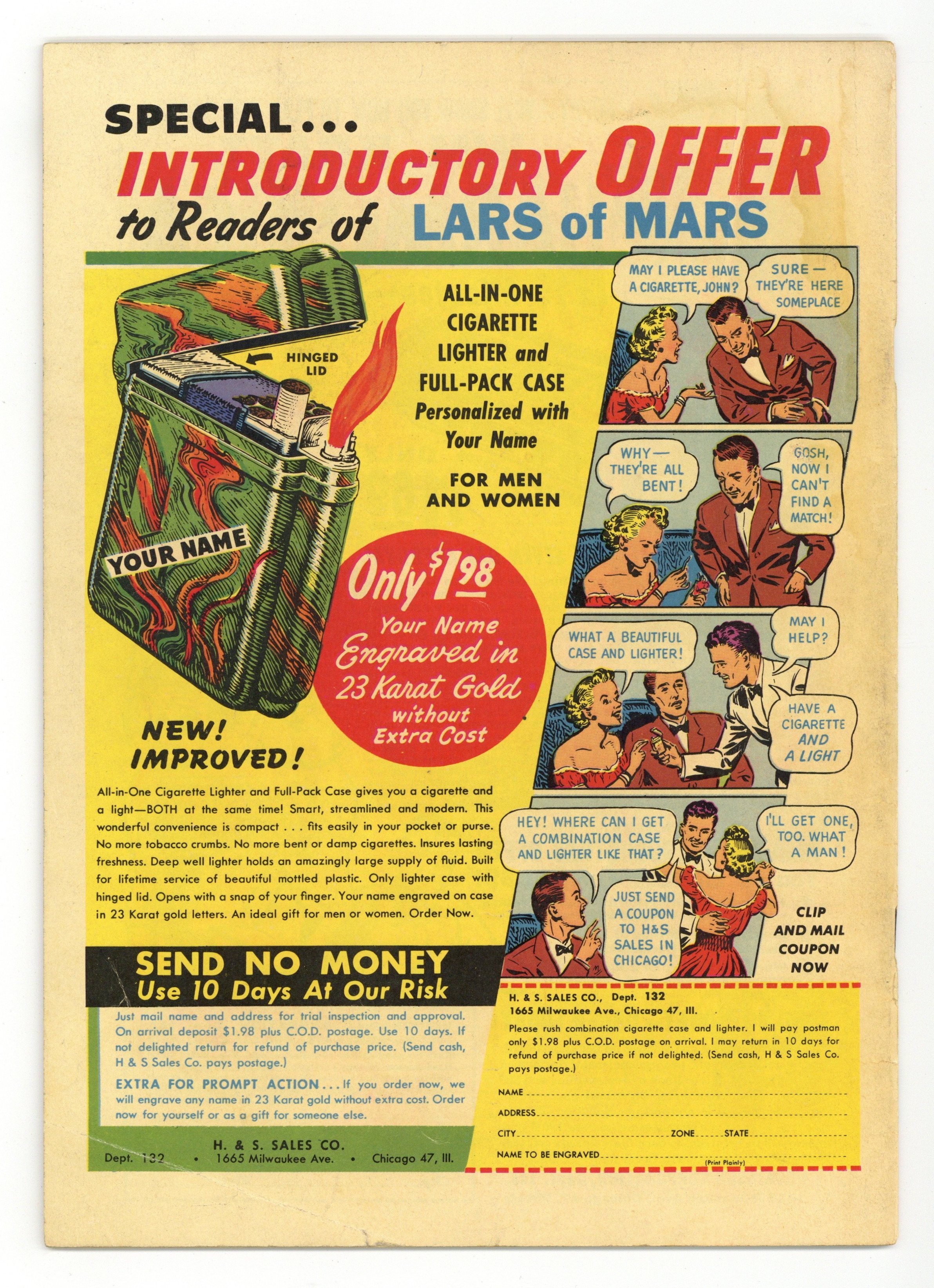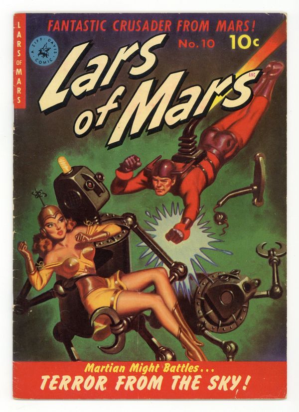 Painted cover by Allen Anderson. Stories and art by Gene Colan, Jerry Siegel, Vic Martin, and Murphy Anderson. Sent to Earth to prevent nuclear war, Lars of Mars must first convince TV producer June Conway that he's a real Martian. In the meantime, he is abducted by crime boss Bixby, who forces him to take part in a bank robbery. The writer for the Lars stories is Jerry Siegel, co-creator of Superman, who said, "I knew people would have difficulty forgetting a Martian with a Swedish name." Captain Ken Brady, Rocket Pilot, battles space pirates, in a story with early art by future Marvel legend Gene Colan. Plus a history of Earth's fascination with Mars and the people who might live there. And fun facts about the solar system. Terrific painted cover by Allen Anderson is a smorgasbord of Golden Age sci-fi tropes. Do People Live on Mars?; Lars of Mars; Villain or Hero?; The Boomerang; Captain Ken Brady, Rocket Pilot: Pirates of the Airways!; Modern Miracles; The Terror from the Sky; Solar Facts. 32 pages, Full Color. Cover price $0.10.
