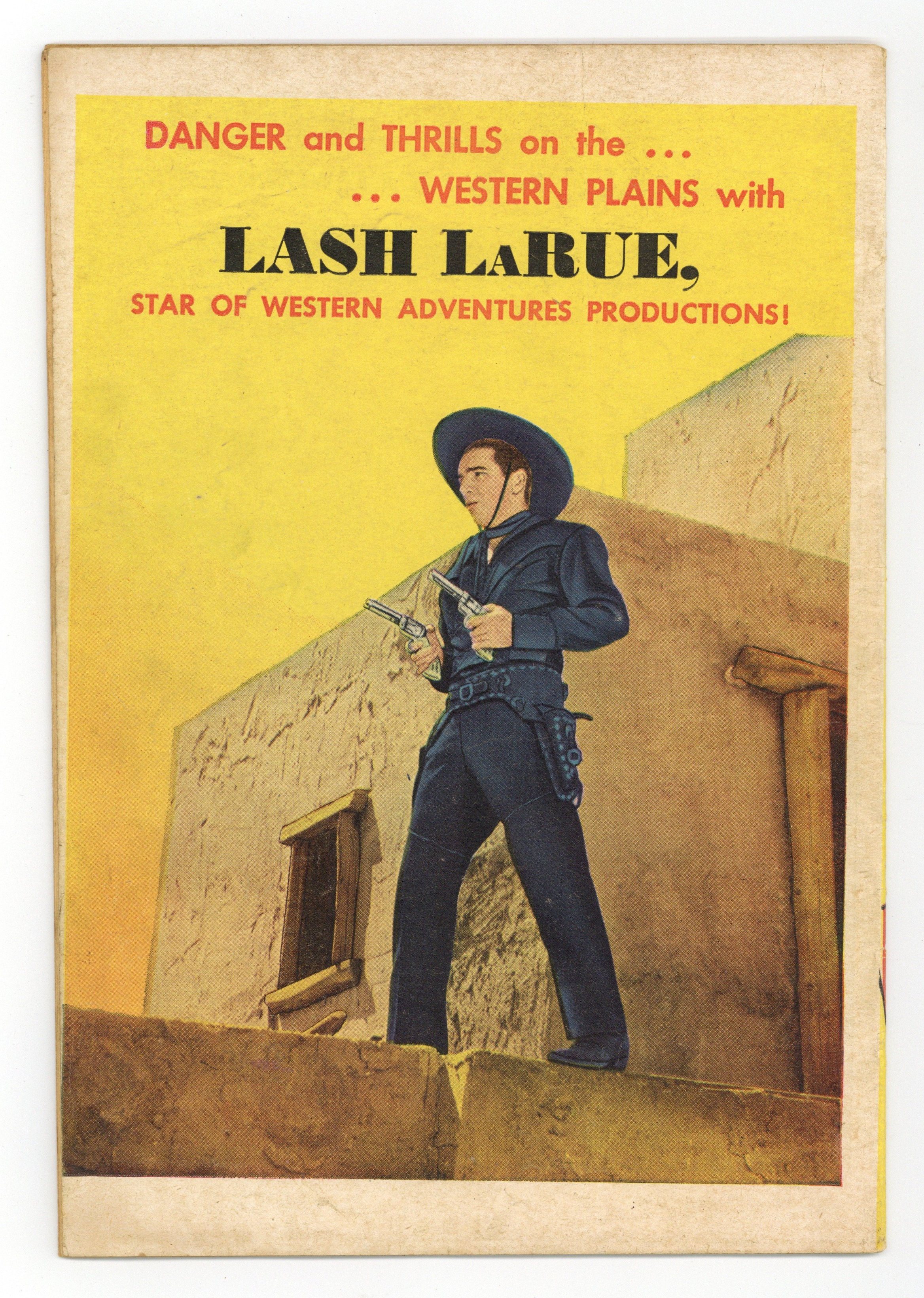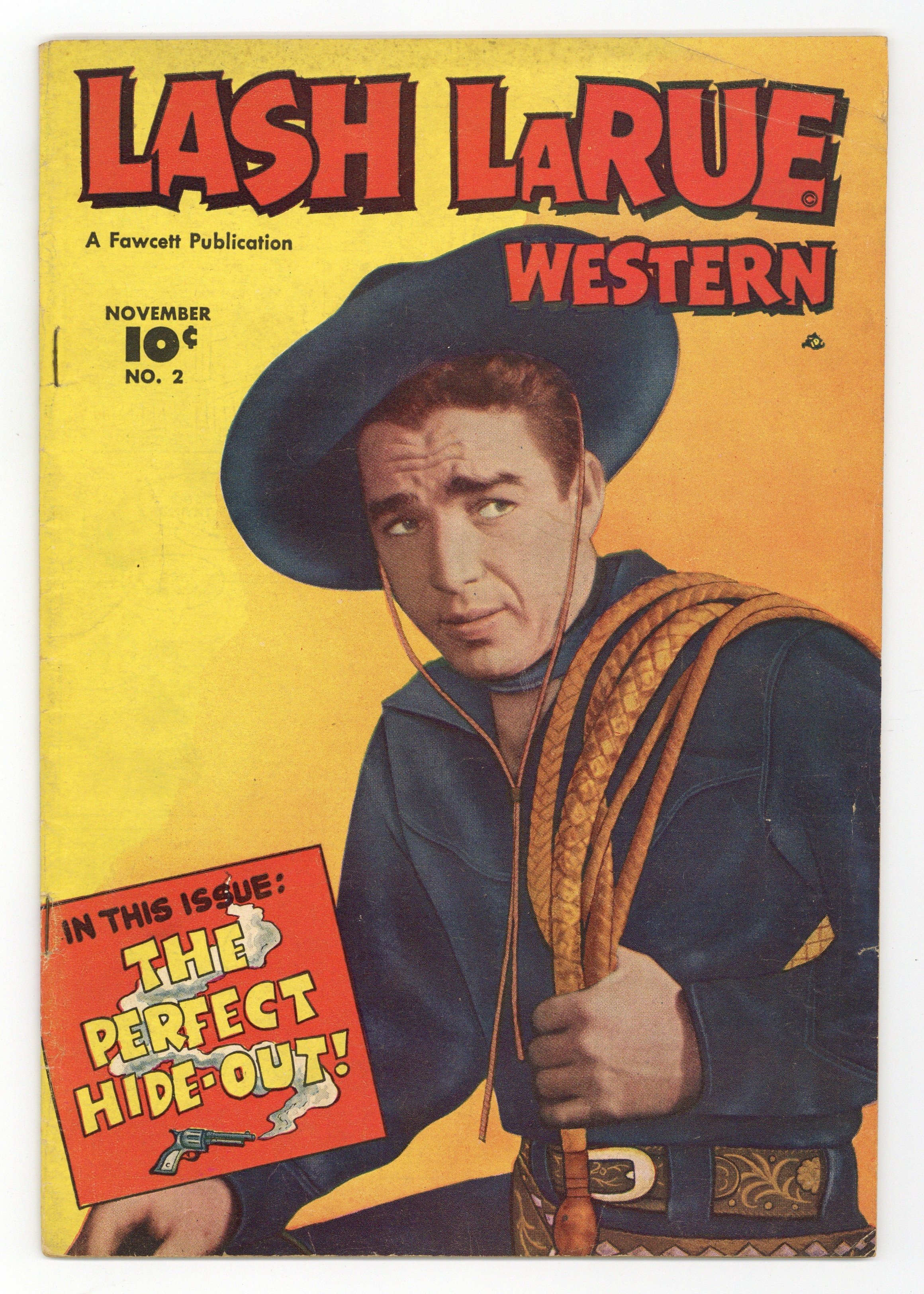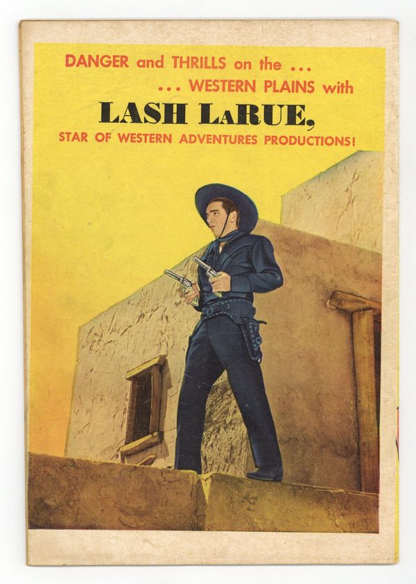 Movie cowboy Lash Larue is known for his trademark black outfit and his skill with a bullwhip. "Roving marshal" Lash takes on the outlaws who have seized the Stone Mountain Silver Mine, even though he has one arm in a sling. Lash runs into his myopic pal Squinty in Hedge City, and the two of them accidentally foil an outlaw's safecracking scheme. When Ned Cleery's gang seemingly vanishes into thin air after raids on Ulster Gulch, the sheriff asks Lash for help. Wagonwheels; The Stone Mountain Escapade; Molasses Mouth; The Saga of Squinty; Saddlehead; Brothers; Dusty: The Close Shave; The Perfect Hide-Out. 32 pages, Full Color. Cover price $0.10.