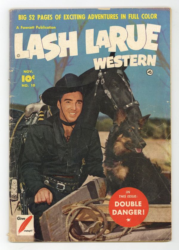 Stories and art by Tony Sgroi and others. Movie cowboy Lash Larue is known for his trademark black outfit and his skill with a bullwhip. "Roving marshal" Lash investigates when a small-town newspaper accuses an innocent man, and then he meets the Post Office Bandits. When outlaws stumble onto a gold mine, they can't file a legal claim without getting arrested, so they decide to take all the gold they can carry. Squinty tries out with the whip to become Lash's sidekick, but the results are just comical. Double Danger; Wagonwheels; Saving the Stage; Squinty's Revenge; Missing Loot!; Dusty: All's Fine; Molasses Mouth; Archer the Artist; Dick and Wick; Steve the Student; The Post Office Bandits. 48 pages, Full Color. Cover price $0.10.