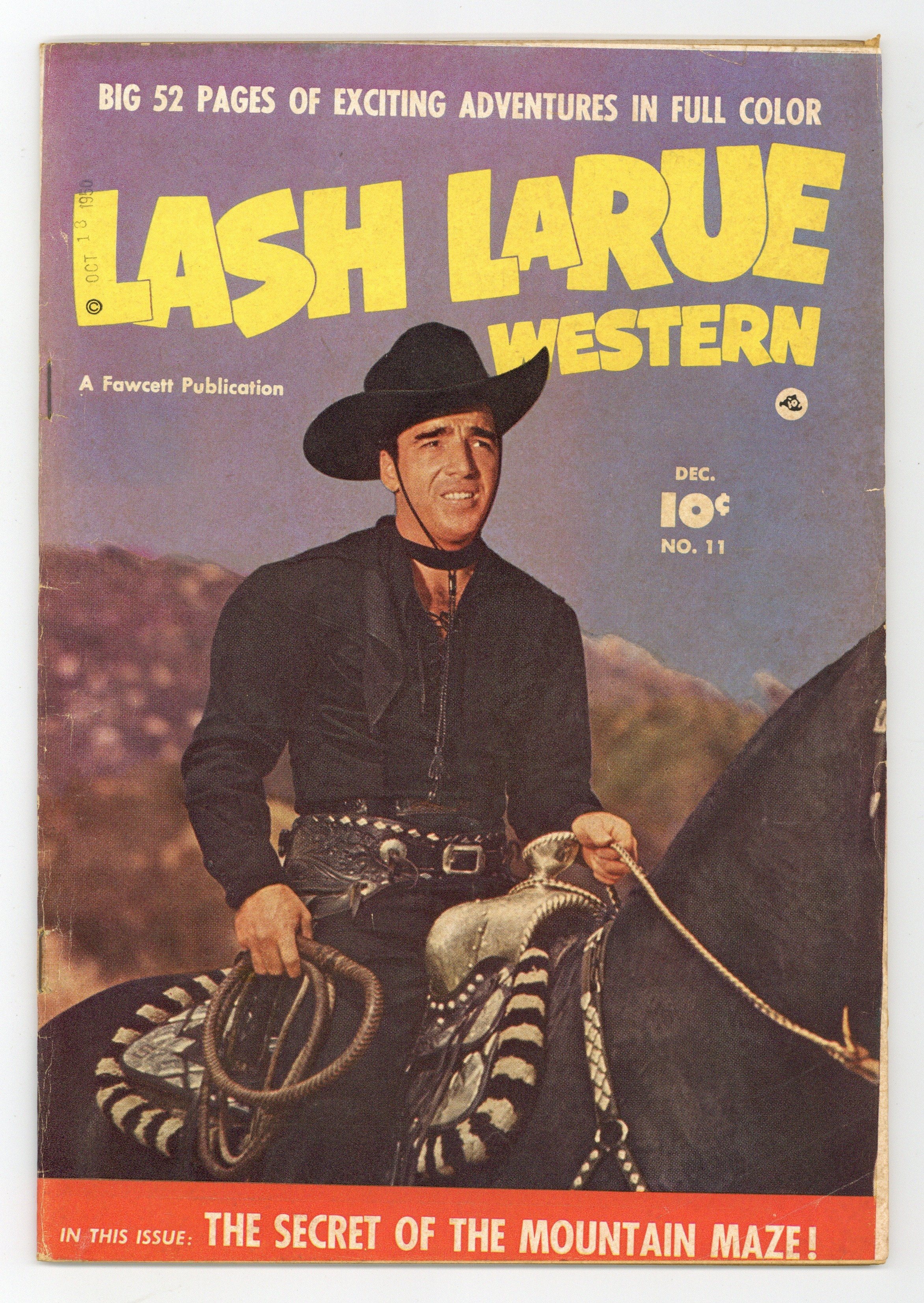 Published Dec 1950 by Fawcett/Charlton.$19.00Movie cowboy Lash Larue is known for his trademark black outfit and his skill with a bullwhip. "Roving marshal" Lash encounters rogue Orachian Natives when he investigates the Mystery of the Seven Totem Poles. Lash insists that his myopic sidekick Squinty get new glasses, leading to a mix-up with a beauty pageant judge. When a man actually wins at a crooked casino, Lash must protect his life. Plus a vintage ad for Lash Larue whips, t-shirts and merch ("Personally selected by Lash Larue for quality and value"). And a Western-themed ad for movie cowboy Rocky Lane's "favorite malted milk." The Mystery of the Seven Totem Poles; Lawson the Lawyer; Desert Poison; Squinty's Judgment Day; The Secret of the Mountain Maze; Dusty: The Pay-Off; Molasses Mouth; The Last Chance. 48 pages, Full Color. Cover price $0.10.