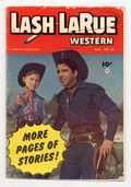 Movie cowboy Lash Larue is known for his trademark black outfit and his skill with a bullwhip. "Roving marshal" Lash tries to help a town through an epidemic of the "red rash," but outlaws plan to use the crisis to cover a robbery. Belle Buckley, the "Prairie Nightingale," conspires with her boyfriend to steal a gold shipment that he and Lash are supposed to be guarding. Dusty tells his neighbor about the elevator dance - it doesn't have any steps. Hair Breath Escape; Belle Buckley: Gold Town Siren!!!; Wagonwheels; Molasses Mouth; The Prairie Epidemic!; Dusty: The Dancemaster; The Phony Letter. 32 pages, Full Color. Cover price $0.10.