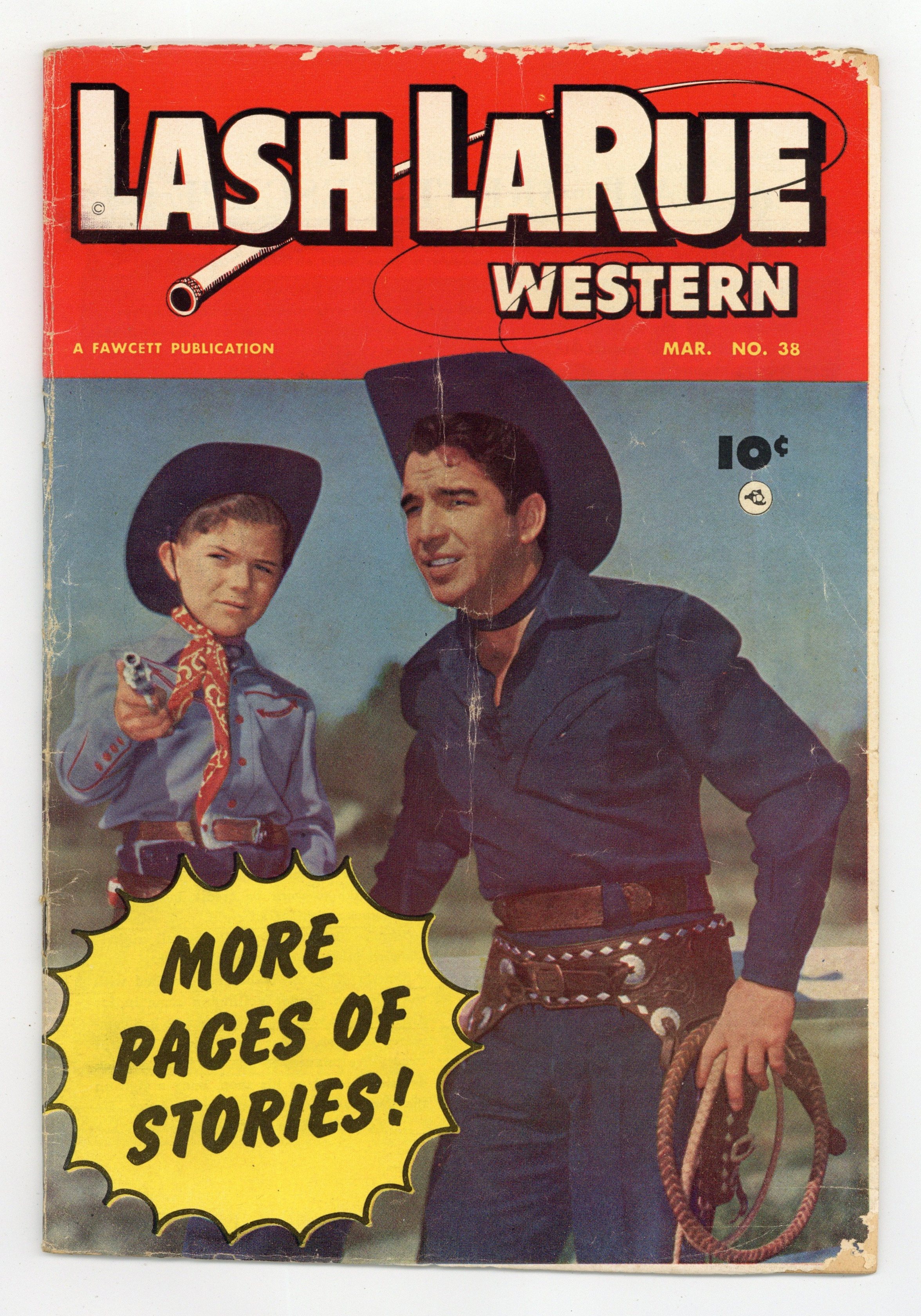 Published Mar 1953 by Fawcett/Charlton.$10.50Movie cowboy Lash Larue is known for his trademark black outfit and his skill with a bullwhip. "Roving marshal" Lash tries to help a town through an epidemic of the "red rash," but outlaws plan to use the crisis to cover a robbery. Belle Buckley, the "Prairie Nightingale," conspires with her boyfriend to steal a gold shipment that he and Lash are supposed to be guarding. Dusty tells his neighbor about the elevator dance - it doesn't have any steps. Hair Breath Escape; Belle Buckley: Gold Town Siren!!!; Wagonwheels; Molasses Mouth; The Prairie Epidemic!; Dusty: The Dancemaster; The Phony Letter. 32 pages, Full Color. Cover price $0.10.
