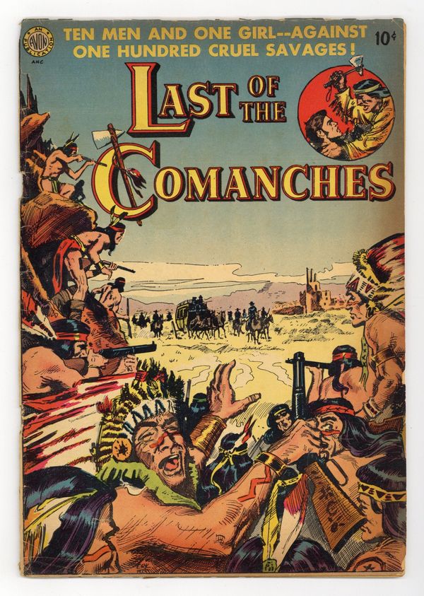 Movie comic for "Last of the Comanchies" starring Broderick Crawford, Barbara Hale, and Lloyd Bridges. Everett Raymond Kinstler cover and art. Back-up story, "The Brown Bomber" with art by Louis Ravielli. Cover price $0.10.