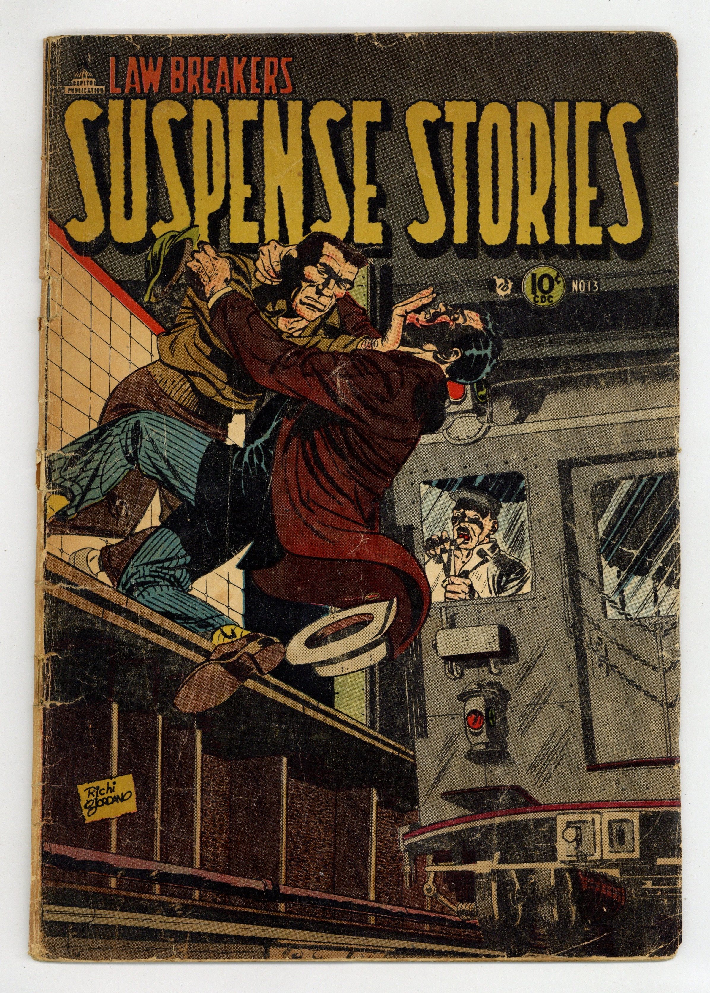 Cover by Dick Giordano. Stories and art by Dick Giordano, Carl Memling, Stan Asch, John Belfi, Albert Tyler, Sal Trapani, Lou Morales and Bob Forgione. Pre-Code crime comics typical of the era, featuring violent crimes, no-nonsense cops, and grim fates for the lawless. A man kills his wealthy uncle for his fortune, then visits a fortune-teller who claims his uncle desires vengeance from beyond the grave. An injured criminal plans to escape through a hospital window, but he doesn't know his room has been moved to a higher floor. A hired killer plans to push his intended victim in front of a subway train, but things don't quite go as planned. Death Raps Twice; Escape from the Noose; Hot Seat; The Vibrations of Destruction; Murder on Time; Sharp Idea!!!; Change in Script!; Deep Freeze. 36 pages, Full Color. Cover price $0.10.