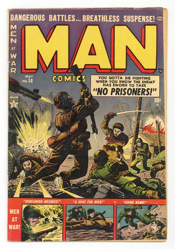 "Bouncing Betsys" (art by Jerry Robinson), "No Prisoners," "A Spot For Nick" (art by Mac Pakula), "Screaming Meemies" (script by Hank Chapman, art by Dave Berg), and a two-page text story, "The General Was In a Hurry." Cover price $0.10.
