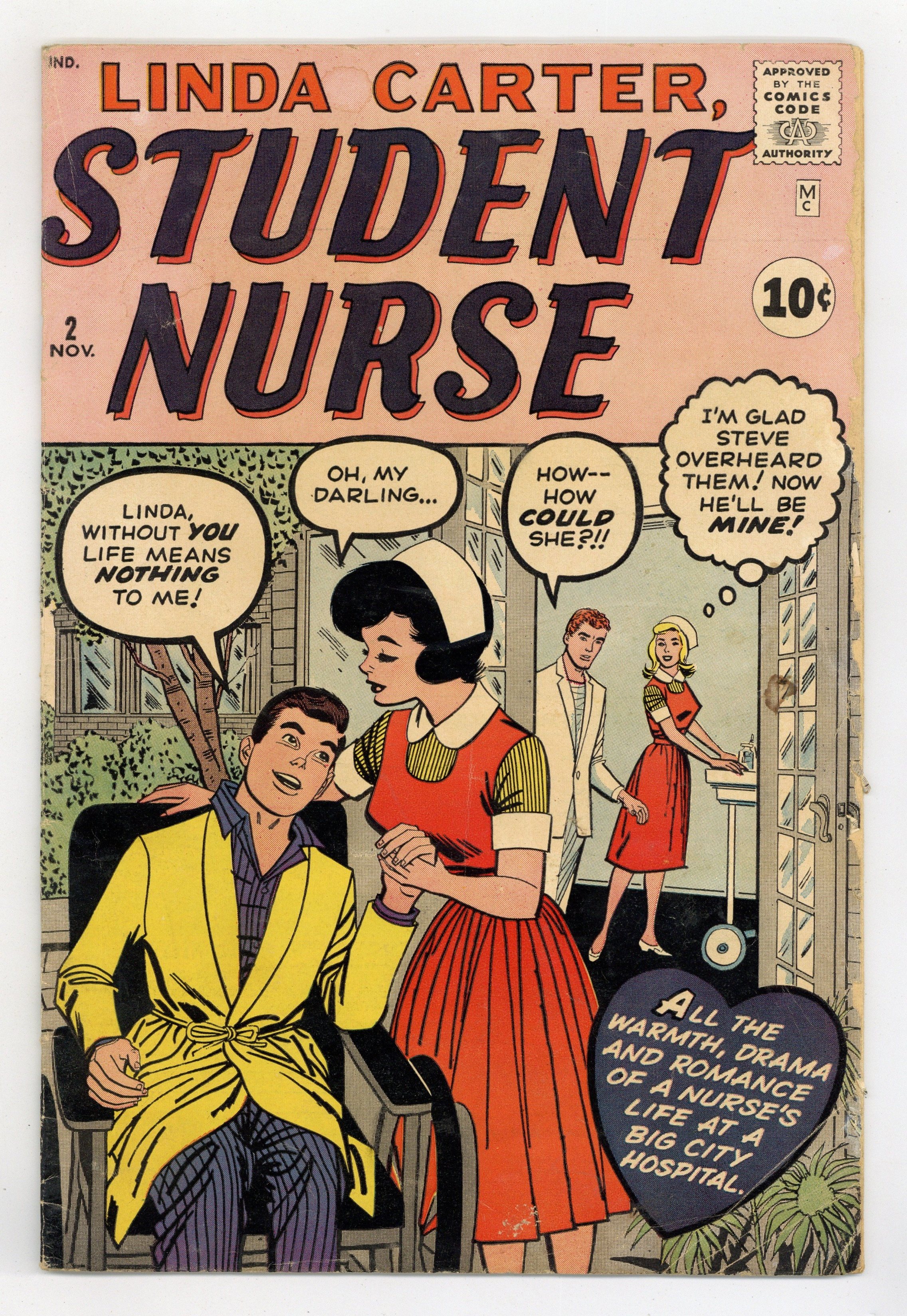 Stories by Stan Lee. Art and Cover by Al Hartley. All the warmth, drama and romance of a nurse's life at a big city hospital! Linda Carter, Student Nurse in: three untitled stories; "Linda's Lovely Fashions" activity page; two untitled 2-pagers; and one untitled 1-pager. Plus: "Beauty at the Beach!" activity page; "Gwen Glitter's Gorgeous Clothes!" activity page; 2-page text story "The Surprise Guest" (writer unknown), reprinted from Miss America Magazine Vol. 7 1952 (#45-93) #87; and "Let's Dress the Boys! Featuring Steve Stuart" activity page. 32 pages, full color. Cover price $0.10.