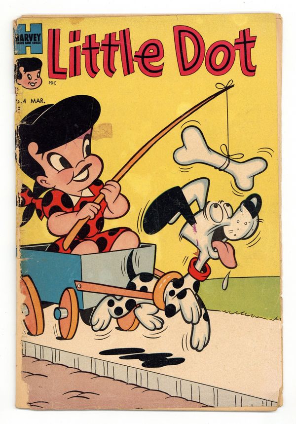 Stories and art by Steve Muffatti and others. One of the mainstays of Harvey's long-running kids' comics, Little Dot also features Richie Rich and Little Lotta. Little Dot turns out to be surprisingly fast on the track at the midget auto races. Richie Rich accidentally disrupts a movie shoot, in a rare story that does not focus on his wealth. Little Dot Meets Uncle Speedy; Richie Rich: Ride 'em Cowboy; Little Lotta. 32 pages, Full Color. Cover price $0.10.