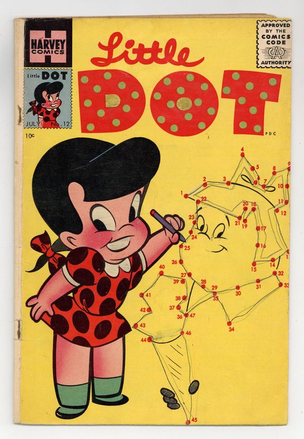 Stories and art by Steve Muffatti and others. Cover by Warren Kremer. One of the mainstays of Harvey's long-running kids' comics, Little Dot also features Richie Rich and Little Lotta. Richie Rich and his friends go to a dude ranch, but his rude cousin Reggie crashes the party. Richie and his pals follow a treasure map. The cover features an actual connect-the-dots puzzle; these were often completed by the comic's original owners. Little Dot; Richie Rich: Out West; Little Lotta; Richie Rich; Little Lotta. 32 pages, Full Color. Cover price $0.10.