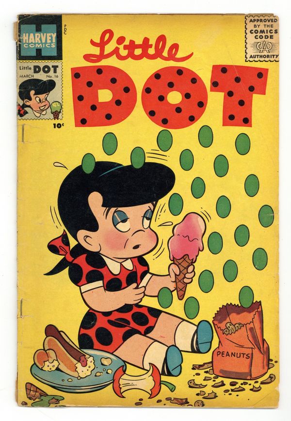 Stories and art by Steve Muffatti and others. Cover by Warren Kremer. One of the mainstays of Harvey's long-running kids' comics, Little Dot also features Richie Rich and Little Lotta. Little Dot learns to create dotted lines with her pogo stick so her friends can always find her house. Richie Rich's ill-mannered pal Clarence gets a new perspective after a boy saves his life. Richie manages to bring Dot and the entire gang to the drive-in movie for two bits, thanks to Daddy Rich's stretch limo. Little Dot; Richie Rich: Some Voyage; Little Lotta; Richie Rich; Little Lotta. 32 pages, Full Color. Cover price $0.10.