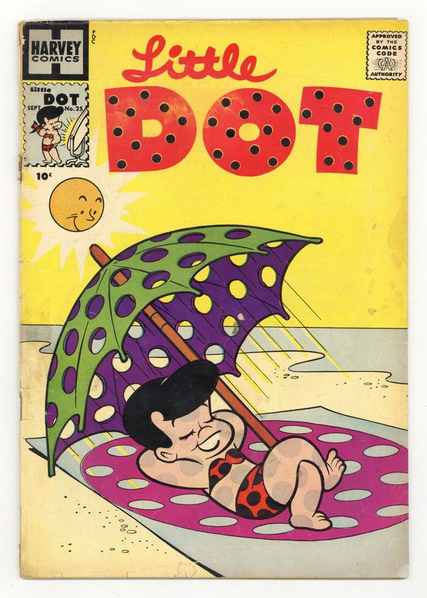 Stories and art by Steve Muffatti and Warren Kremer. One of the mainstays of Harvey's long-running kids' comics, Little Dot also features Richie Rich and Little Lotta. Little Dot's habit of "dotting" everything covers up the hole where a crook hid his loot. The latest addition to Dot's wacky family tree is Uncle Windy. Richie Rich accidentally sells 10,000 power mowers while trying to mow the lawn. This and Dot; Uncle Windy Comes to Town; Little Lotta: For Arts Sake; Clay Pigeon; The Laughing Princess; Richie Rich: The Mower the Merrier; Richie Rich; Little Lotta. 32 pages, Full Color. Cover price $0.10.