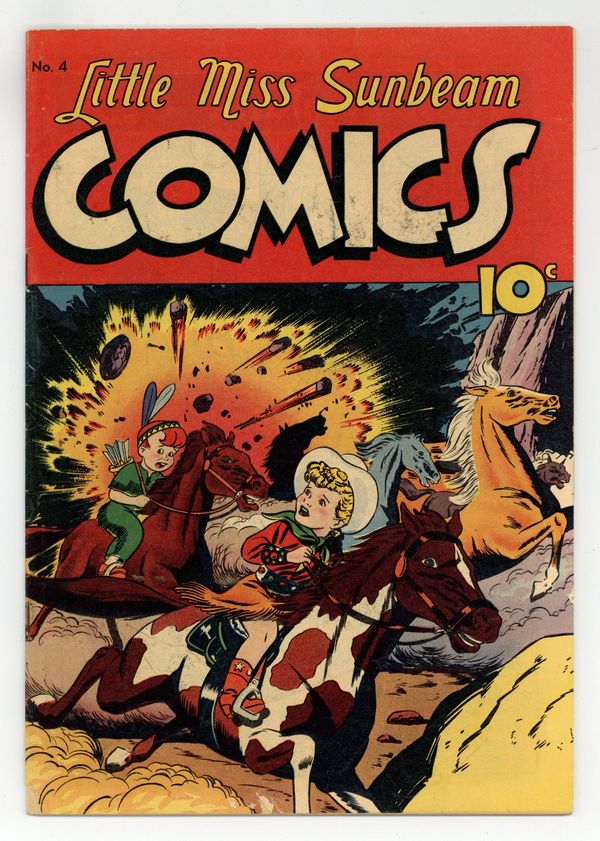 Published Dec 1950 by Magazine Enterprises.$21.50Adventures of Little Miss Sunbeam, the bread-company mascot created by Ellen Segner. A promotional series of the same title was also published as a giveaway. Sunny and Weegee encounter outlaws during a wild horse roundup out West; The gang puts on a play that becomes a runaway hit when a poster mishap has Clark Cable starring in it; The kids race gangsters to find Blackbeard's buried treasure. Sunbeamland Puzzle Page; The Desperados of Devil's Gap; Gus the Grocer; Toothy Snyder, Delivery Boy; Sunbeamland Quiz and Game Page; The Treasure in the Sand!; Pencil Fun with Little Miss Sunbeam. Final issue of the series. 32 pages, Full Color. Cover price $0.10.