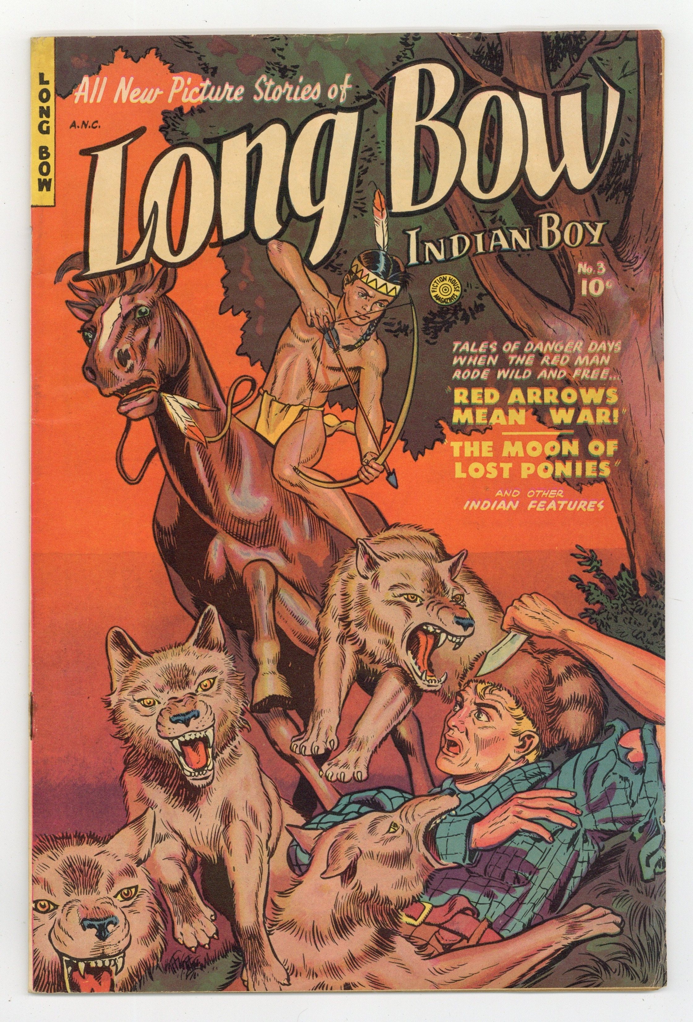 Cover by Maurice Whitman. Adventures of Long Bow, a young Blackfoot boy raised by kindly Trapper Jim. Long Bow becomes a rider in a hotly contested horse race; Long Bow's friend Mud Hen builds a set of wings and tries to fly; Long Bow neglects to watch the smaller children, and they soon find themselves in danger. Another dramatic cover by Maurice Whitman. Long Bow; Red Arrows Mean War; The Moon of Lost Ponies; Old Squaw's Thumb!; Be On Watch! 32 pages, Full Color. Cover price $0.10.