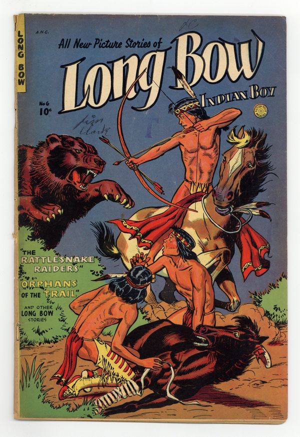 Cover by Maurice Whitman. Adventures of Long Bow, a young Blackfoot boy raised by kindly Trapper Jim. The Utes return a Blackfeet captive as a token of peace; A Mandan raider captures Bright Star and demands the boys help him escape the Blackfeet camp; The mysterious shaman who lives behind Old Stone Face helps the boys protect a white teen from Pawnee raiders. Another dramatic cover by Maurice Whitman. The Rattlesnake Raiders; Orphans of the Trail; Long Bow. 32 pages, Full Color. Cover price $0.10.