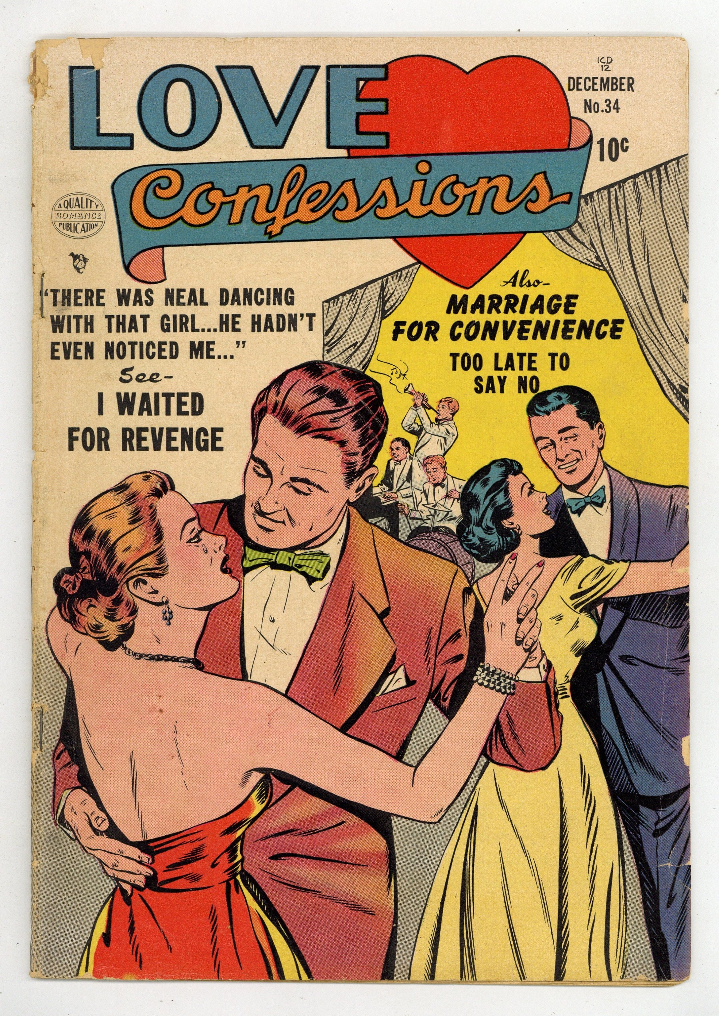 Cover by Charles Sultan. Stories by unknown. Art by Charles Sultan, Bill Ward, W.G. Hargis, Dick Beck and unknown. There was Neal, dancing with that girl! Find out what happens next in..."I Waited for Revenge" starring Arlene, Ginny, Jim, Johnny, Neal Patterson and Patty. Also featuring: "A Boy In Every Town" starring Fran Perry, Mr. Perry, Mrs. Perry and Roy Childs; "Marriage for Convenience" starring Alice Terry, Miss Johnson, Paul Shelby, Rachel, Ralph and Tommy; and "Too Late to Say No" starring Dave Shelly, Gloria Victor, Mrs. Porter and Paul Kearns. Plus: 1-page retitled reprint text story "Unlock Your Heart" starring Doris, Gary, Karen, Mrs. Neuman and Shirley. 32 pages, full color. Cover price $0.10.