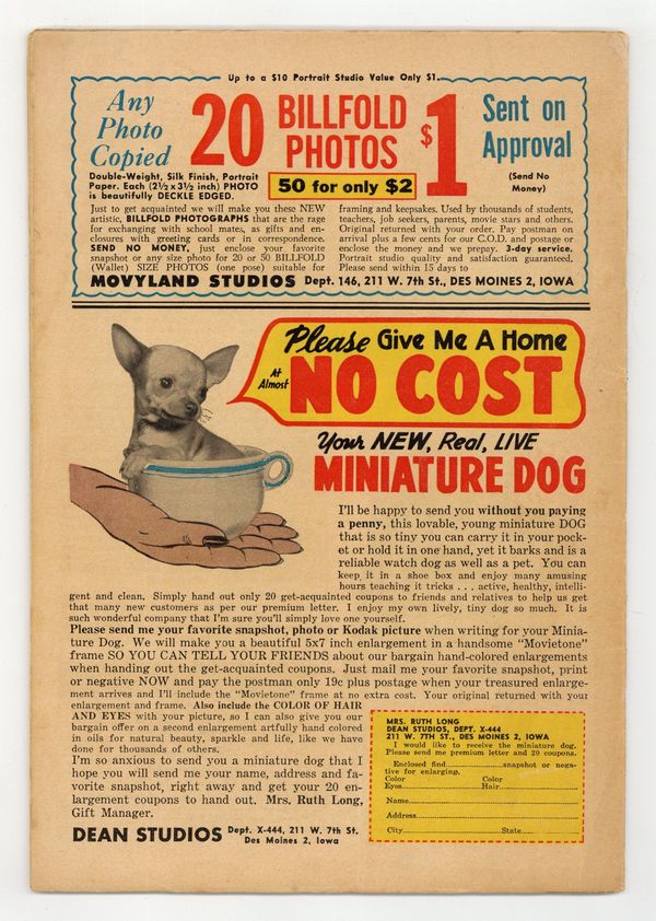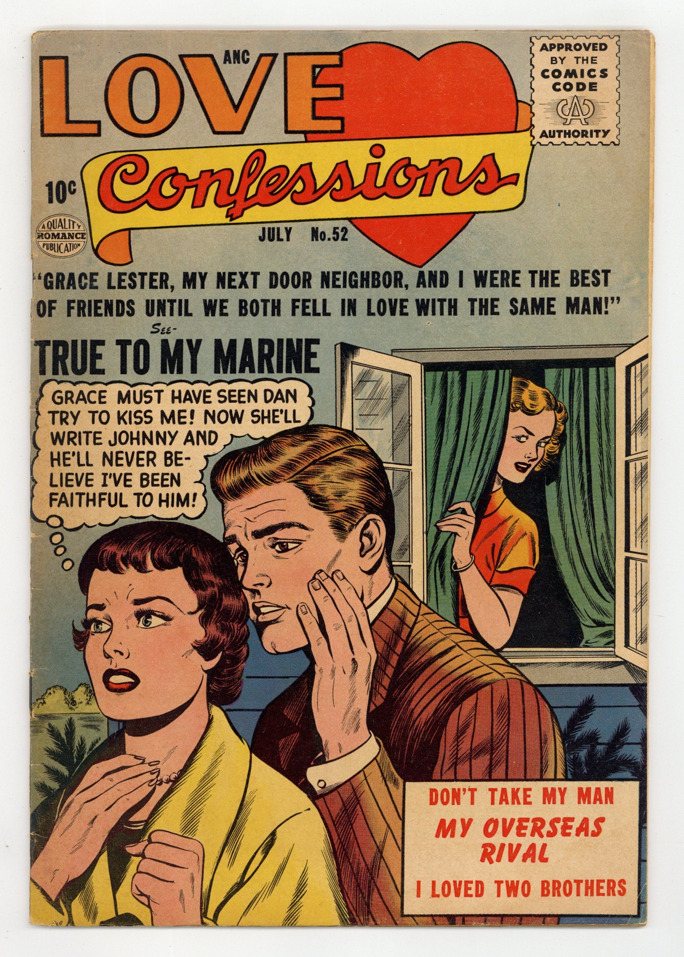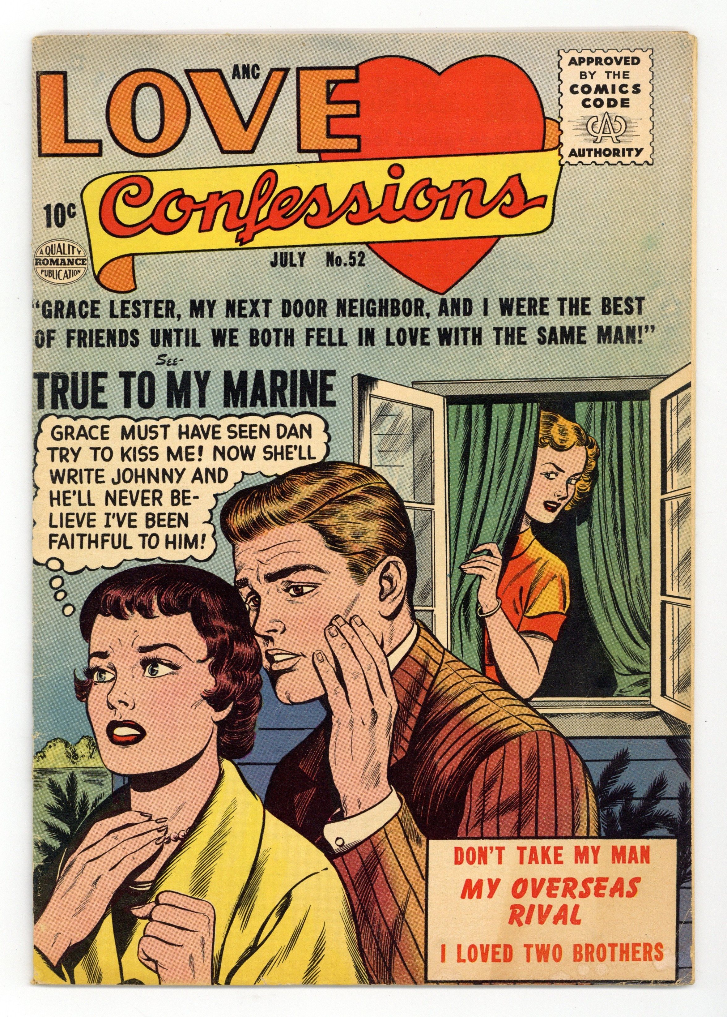 Stories by unknown. Art by unknown. She and Grace Lester, her next door neighbor, were the best of friends...until they both fell in love with the same man! Don't miss..."True to My Marine"! Also featuring: "Don't Take My Man"; "My Overseas Rival"; and "I Loved Two Brothers"! 32 pages, full color. Cover price $0.10.