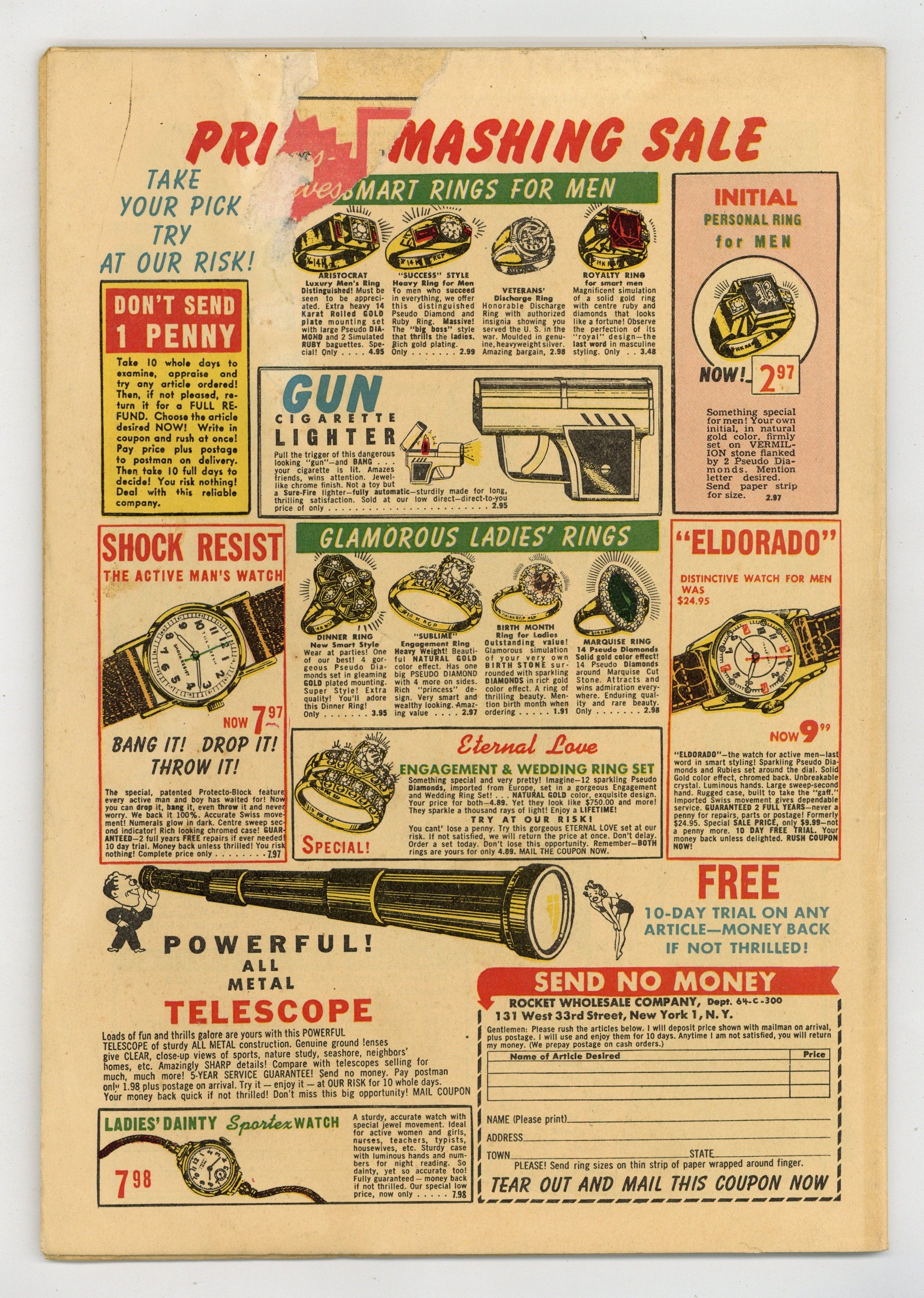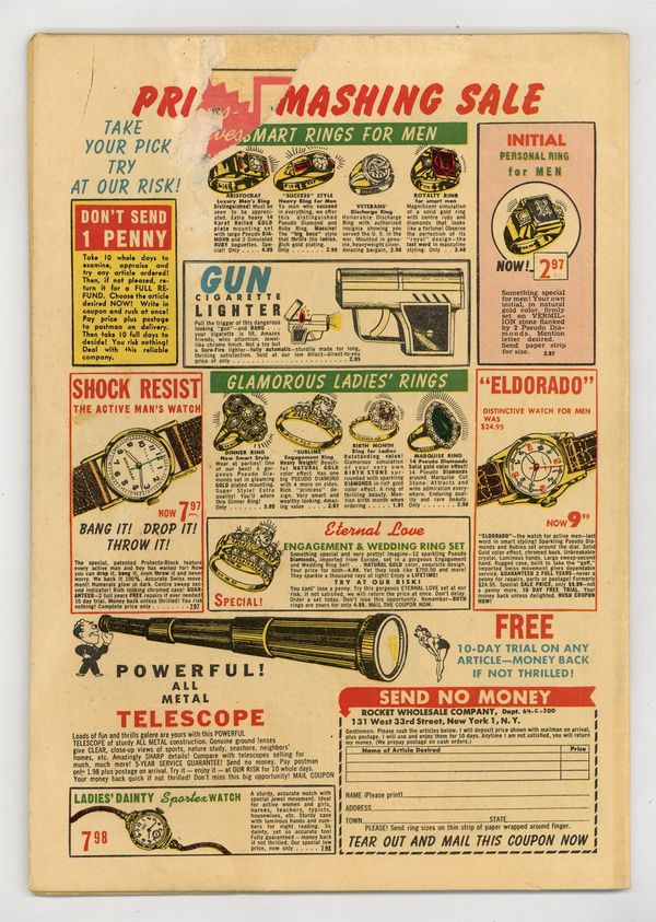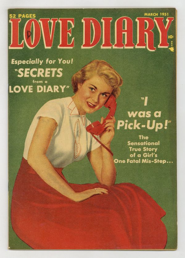 Published 1951 by Our Publishing.$32.00Stories and art by Mort Lawrence, Dorothy Woolfolk, and Mort Leav. A post-war, pre-Code romance comic from pioneering female publisher Rae Herman of Orbit-Wanted (who doubled as Love Diary's advice columnist, Ray Mann). Boyfriend Bert is scandalized to learn that Lila is a "pick-up girl." Patty and Jim marry young, and soon find themselves facing money woes that threaten their relationship. Neat-freak Carol drives away boyfriend Bob with her controlling behavior. I Was a Pick-Up; Unworthy of his Love; Prescription for Happiness; Too Young to Marry; For Better or for Worse; No Place for Love! 48 pages, Full Color. Cover price $0.10.