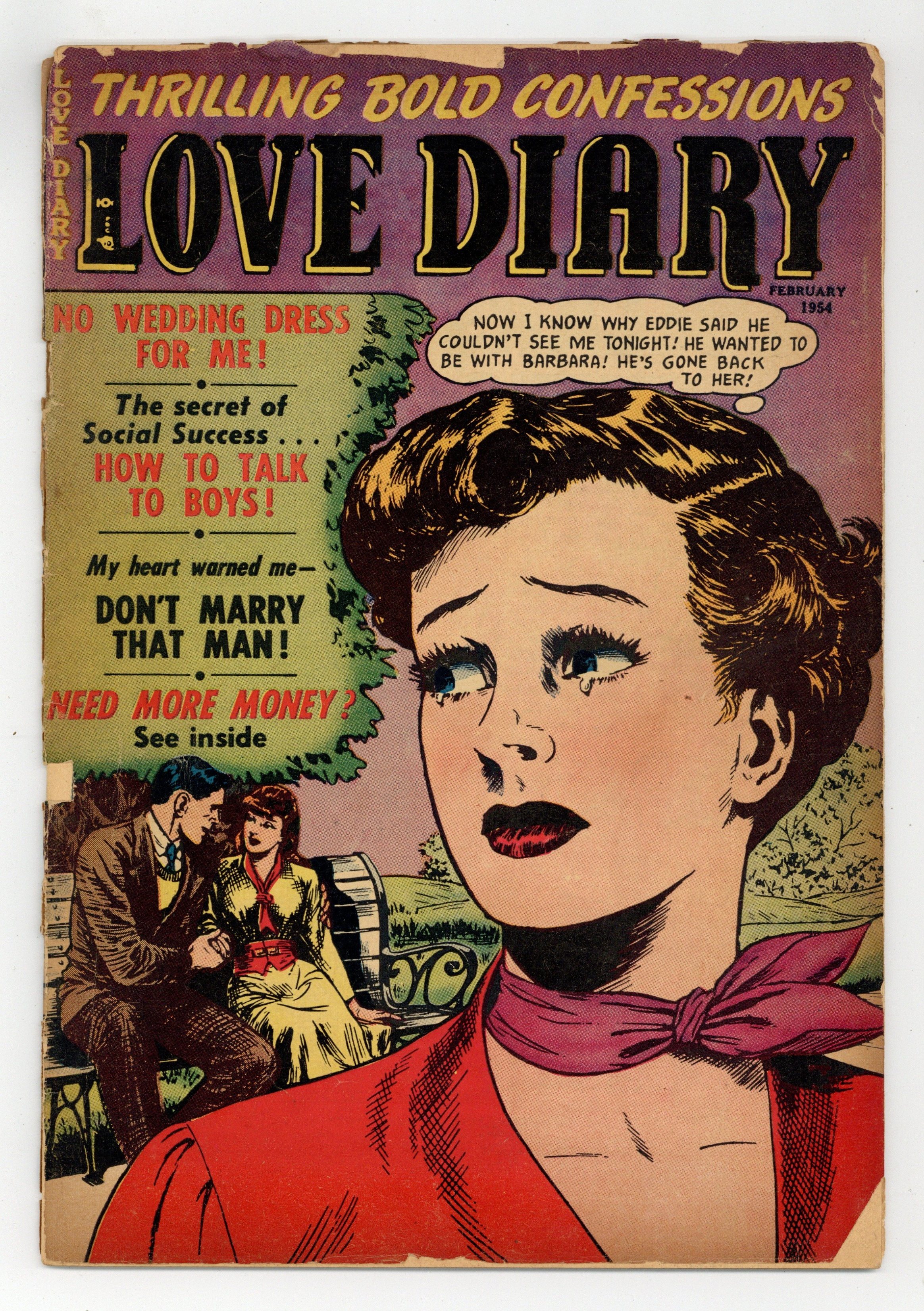 Cover by Harry Anderson. Stories and art by John Buscema, Bill Woolfolk, Chuck Miller and Mort Leav. A post-war, pre-Code romance comic from pioneering female publisher Rae Herman of Orbit-Wanted (who doubled as Love Diary's advice columnist, Ray Mann). Ann is unable to love because of past trauma, but maybe Owen will be different. Trick rider Jill falls for rodeo co-star Tex, but doesn't want a life on the road. Glitzy model Renee is attracted to down-home farmer Sam, and asks "Ray Mann" if such a thing could ever work. Cold, Cold Heart; Don't Marry That Man!; Prescription for Happiness; No Wedding Dress For Me! 32 pages, Full Color. Cover price $0.10.