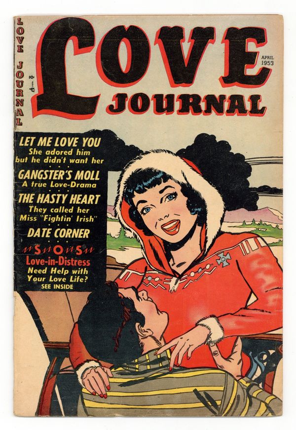 Cover by John Buscema. Stories and art by John Buscema, Mort Leav, and Bill Woolfolk. Offbeat romance comic, from pioneering female publisher Rae Herman of Orbit-Wanted, often featured early work by future comics legends. Argumentative Doreen almost ruins her romance with Tad when she meets his family, in one of two early stories (and cover) in this issue by future Marvel and Conan legend John Buscema. Buscema also drew the S.O.S. for Love story, in which Frances seeks advice from Love Journal after learning her boyfriend's brother has a secret drug habit. Evelyn knows boyfriend Charley has some dicey connections, but she never expected she'd have to testify at his murder trial. Let Me Love You; SOS for Love!; Moll!; Fightin' Irish! 36 pages, Full Color. Cover price $0.10.