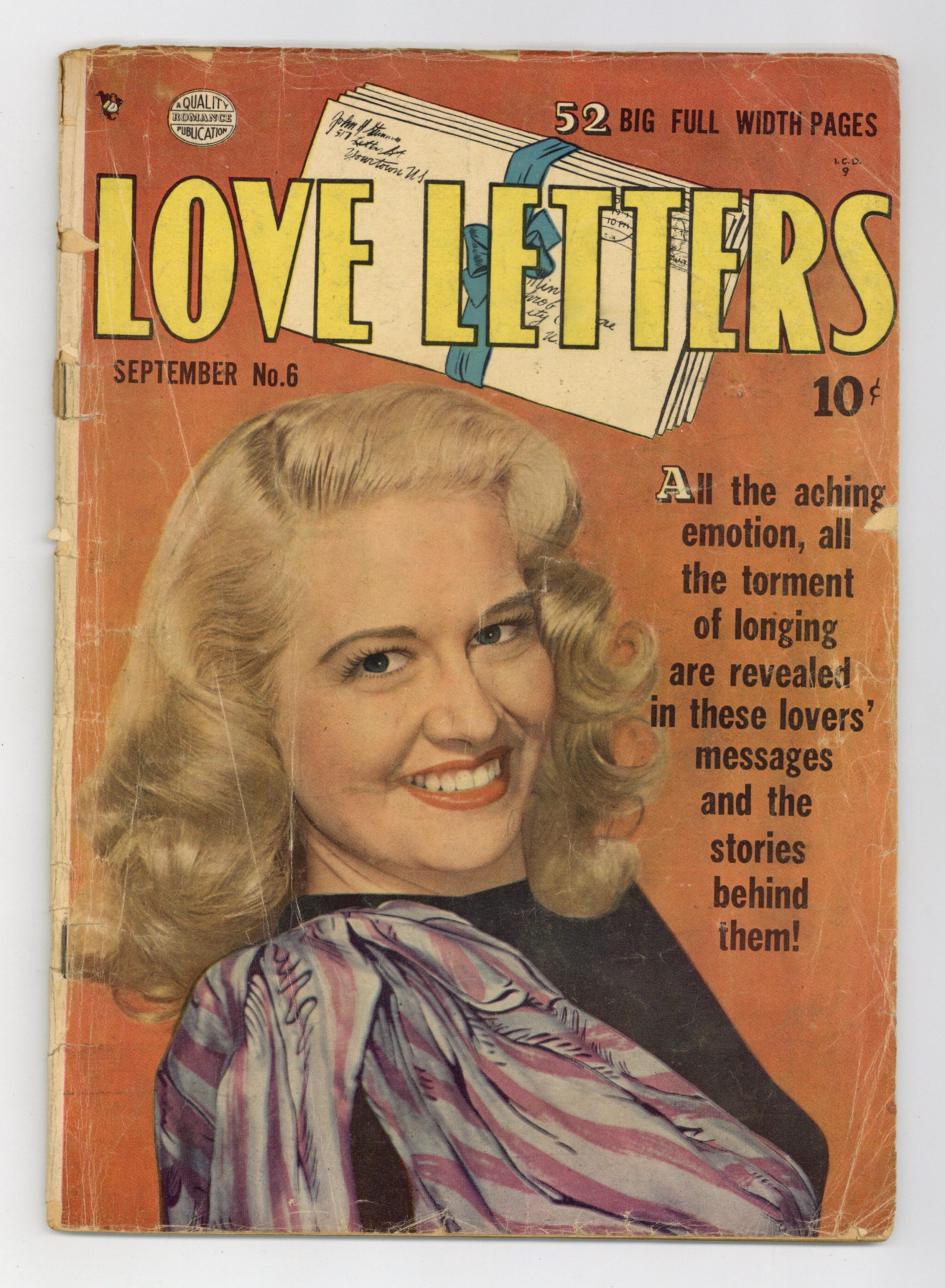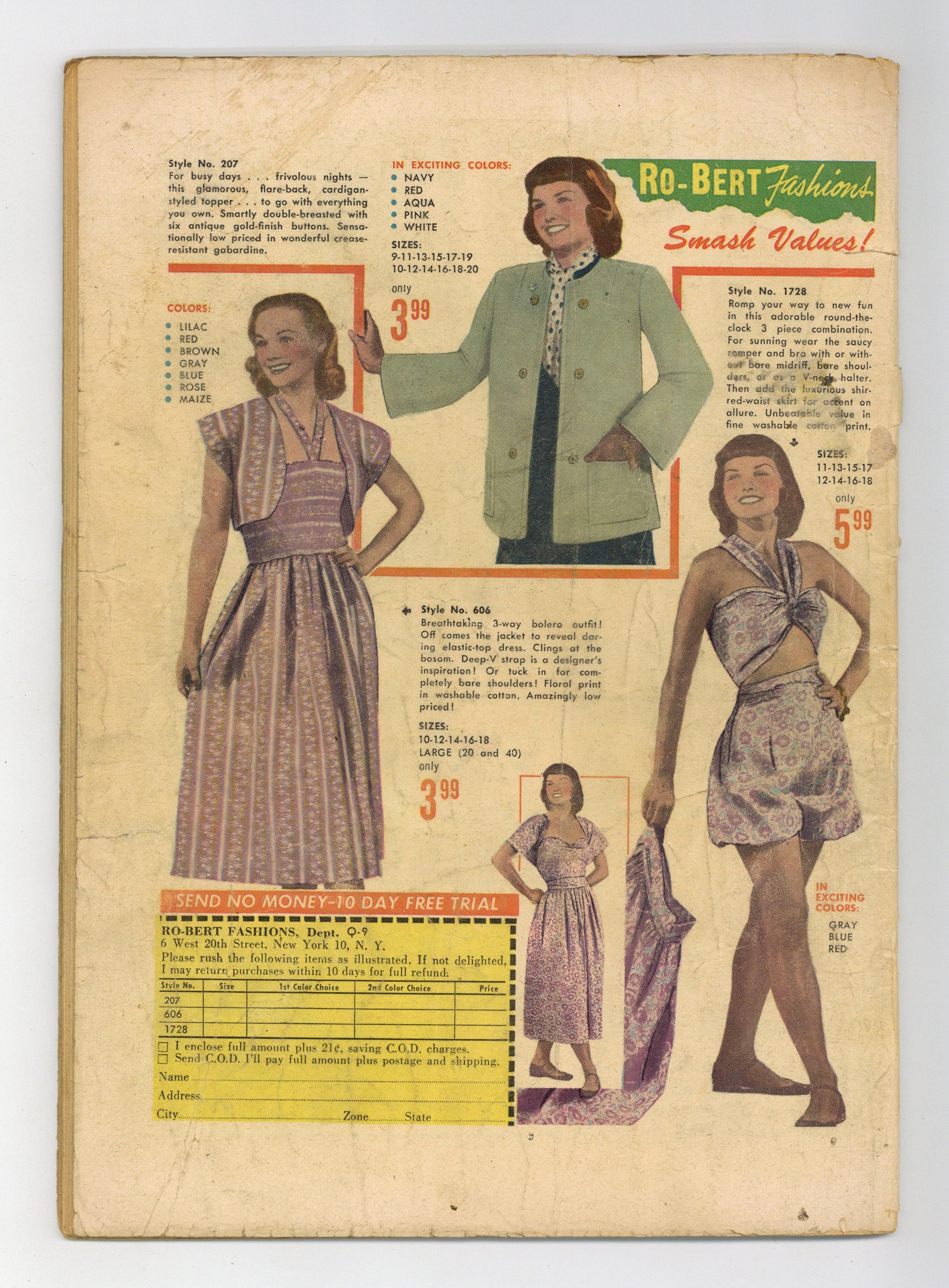 Photo cover of Marilyn Maxwell. Stories by unknown. Art by Charles Quinlan, Alice Kirkpatrick, John Rosenberger and unknown. "A Kingdom for My Kisses" with pencils by Charles Quinlan - Jennifer falls in love with Orin, a member of the diplomatic corps of the European nation of Loreno. Orin says he needs King Basil's permission and takes a photo of her to his monarch; the King decides he wants Jennifer for himself. Jennifer goes to Loreno, where Orin is being held hostage. She rejects Basil's proposal. Before he can call his guards to have Jennifer and Orin executed, Jennifer knocks him out and escapes with Orin. They will return to the USA and wed. Plus: "Playing with Fire" - Furniture designer Mike meets Lee, unaware she is the "designer-president of a successful modern furniture company" (he thinks she's the owner's daughter). They become friends, although he believes "a woman should have brains enough to stick to what nature intended...every woman's goal is marriage and family!" They fall in love, but when Mike finds out Lee is the company president, he believes she's been mocking him and leaves. Lee apologizes and offers Mike a partnership in her company...and her hand in marriage. Also: "Blueprint for Glamour" - Terry is a devoted fan of advice columnist Marla. When Terry falls in love with Kent while on vacation, she discovers Marla is her rival for his affections. Terry decides to do the opposite of what Marla would advise: she beats Kent at tennis, criticises his clothes, and asks him for dates. Kent decides he likes "a frank, honest girl" and proposes to Terry. And: "Faithless!" with pencils by Alice Kirkpatrick - Janet is engaged to Merchant Marine officer Doug. While he's away, she attends a dance school reception and is wooed by the owner Renaldo. He thinks she's wealthy because Janet borrowed a gown from the owner of the house where her parents are poor relatives and servants. Janet dates Renaldo and experiences "an ecstasy so exquisite that it was almost unendurable" when he kisses her. Janet decides to break up with Doug but learns Renaldo is a fortune hunter. When Janet gets home, Doug is there and is none the wiser. Plus: "Portrait of Deceit" with pencils by John Rosenberger - Sheryl lives with her impoverished artist uncle Carl. She steals some of his paintings and sells them to unscrupulous art dealer Mel. Mel gives her a job and Sheryl adopts his dodgy business practices. Mel sends her to a Pacific island where artist Brian lives. Brian and Sheryl fall in love and he gives her several paintings, but when he learns she's sent them to Mel, Brian destroys his portrait of Sheryl and breaks up with her. Sheryl agrees to marry Mel if he returns the paintings, but he welshes on the deal. Sheryl returns to Brian's island and they are reunited. Also: 2-page text story "Red Roses for Me"! 48 pages, full color. Cover price $0.10.
