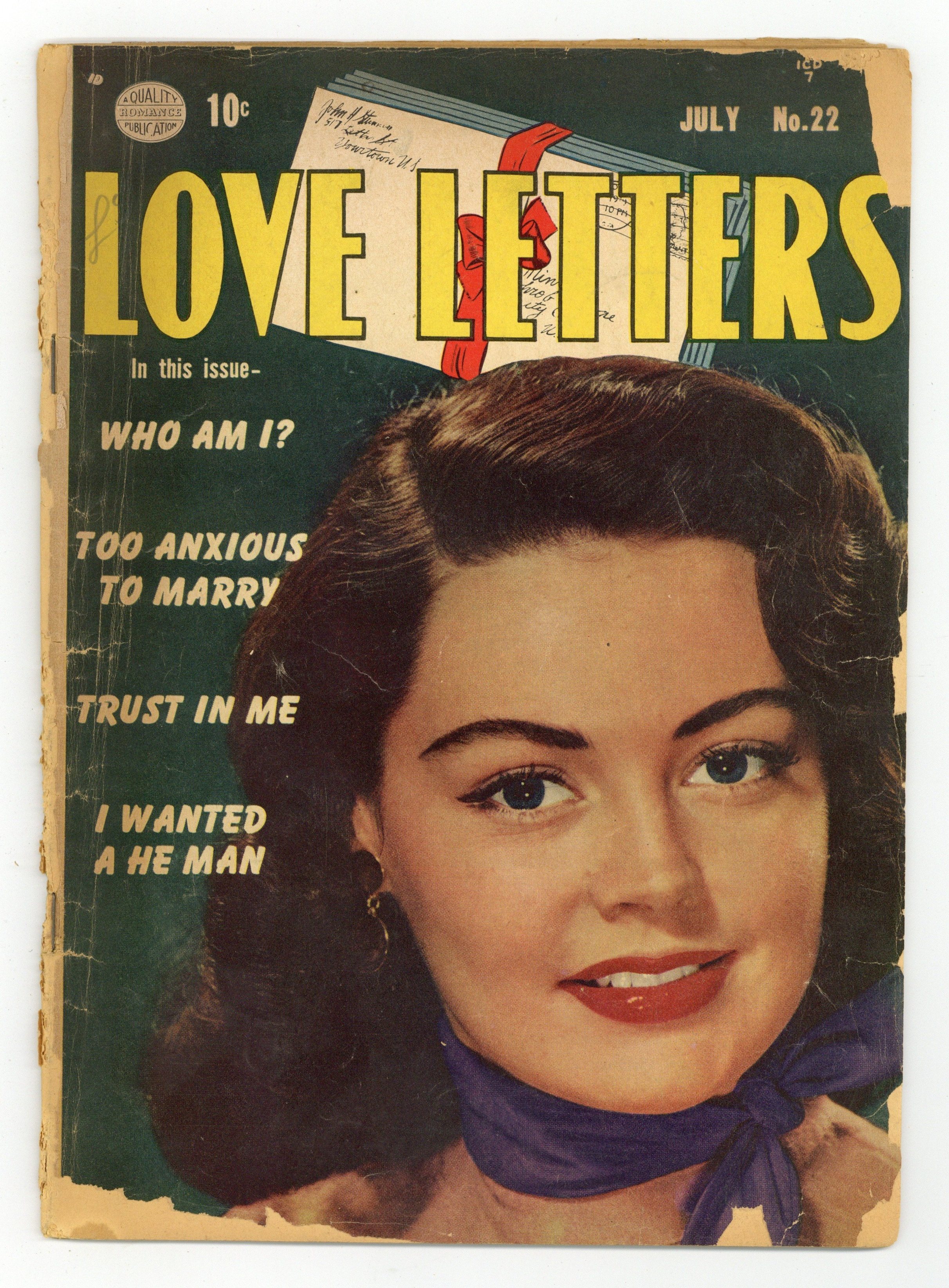 Photo cover. Stories by unknown. Art by unknown. Love letters and the revealing tales of the lovers who wrote them! In this issue: "Who Am I?"; "Trust in Me"; "I Wanted a He-Man"; 1-page text story "The Heiress"; and "Too Anxious to Marry"! 32 pages, full color. Cover price $0.10.