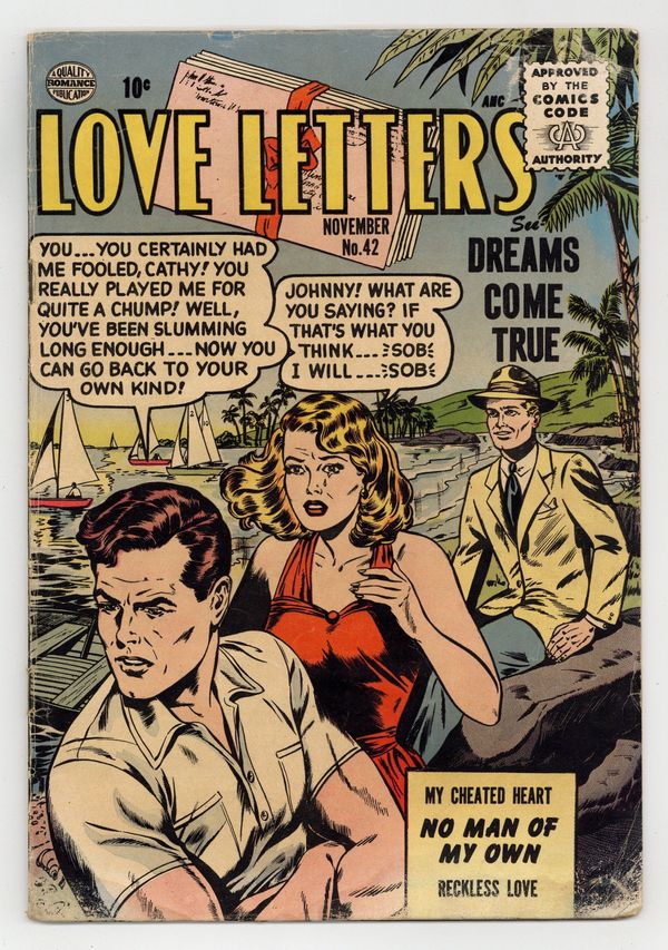 Stories by unknown. Art by Sam Citron, Leo Morey, Charles Sultan and unknown. Love letters and the revealing tales of the lovers who wrote them! In this issue: "You...you certainly had me fooled, Cathy! You really played me for quite a chump! Well, you've been slumming long enough...now you can go back to your own kind!" "Johnny! What are you saying? If that's what you think--sob--I will..." See "Dreams Come True" with pencils by Leo Morey, reprinted from Heart Throbs (1949 Quality/DC) #17 (opening splash panel art changed for reprint; original title: "My Dreams Come True"). Plus: "No Man of My Own" with pencils by Sam Citron; "My Cheated Heart," reprinted from Love Letters (1949) #20; "Reckless Love" with pencils by Charles Sultan, reprinted from Love Letters (1949) #19 (original title: "One Reckless Fling"); and 1-page text story "Love's Barrier"! 32 pages, full color. Cover price $0.10.