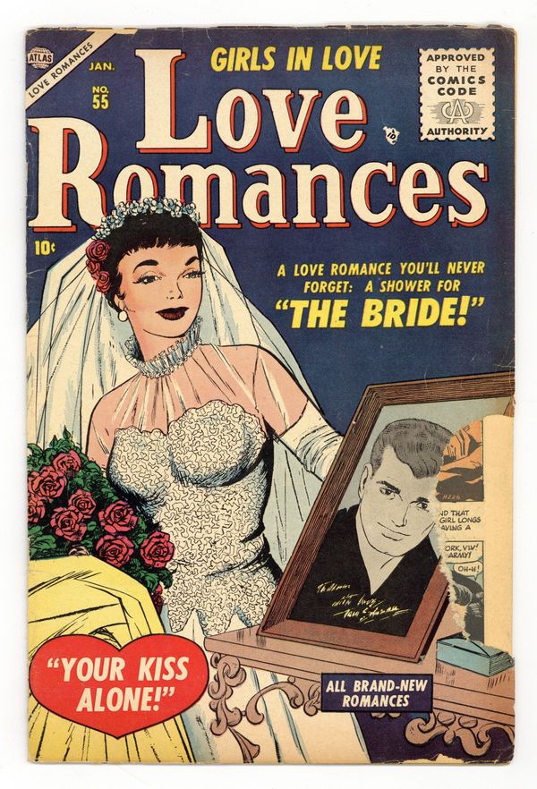 Cover by Tom Scheuer. Edited by Stan Lee. Stories by unknown. Art by Tom Scheuer, Vince Colletta, Jay Scott Pike, John Tartaglione and Matt Baker. When Vivian easily forgets about her first love, she assumes she will forget Donald when he has to leave for a while. However, this time it sticks and she finds herself uninterested in anyone else until Donald returns in "Without You!" Plus: Ellen likes Gregory but she keeps looking for a rich boyfriend, until Gregory dumps her and she realizes her mistake in "Your Kiss Alone!" Also: Laurie attends bridal showers for her friends but wonders if she will ever have one of her own in "A Shower for the Bride!" And: Freshman Bette is flattered when Rock wants to take her out, but it turns out that he knows she works in the dean's office and he wants her to steal exams in "At First Sight!" Plus: Secretary Sally is in love with her boss, novelist Rex Cartwright, but a misunderstanding leads her to believe he will never feel the same way in "Hopeless!" Also: 2-page text story "I Found My Love!" 32 pages, full color. Cover price $0.10.