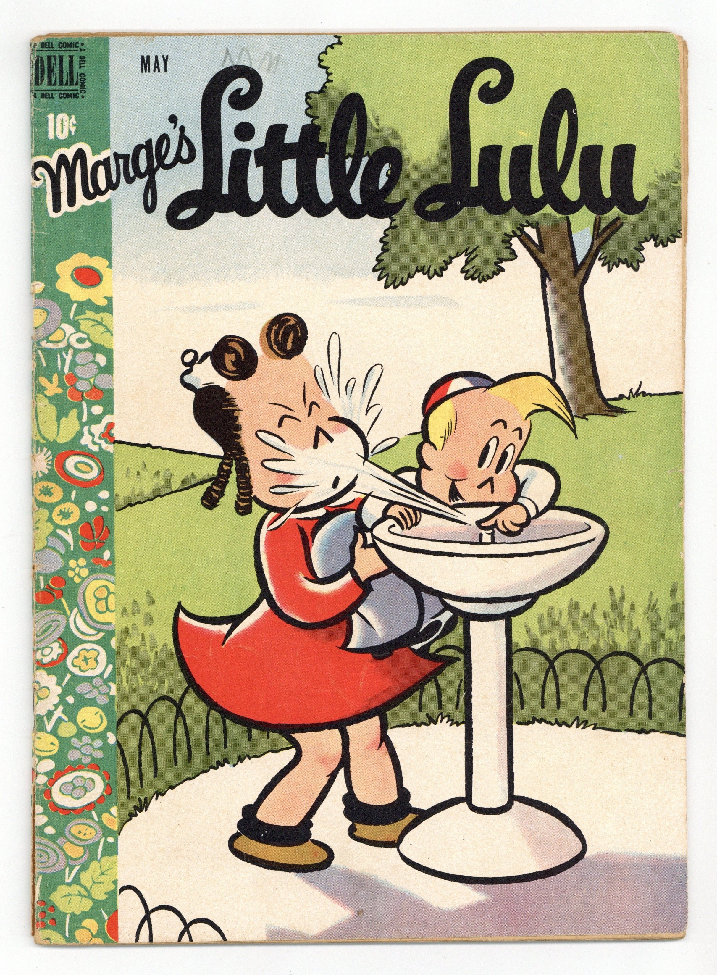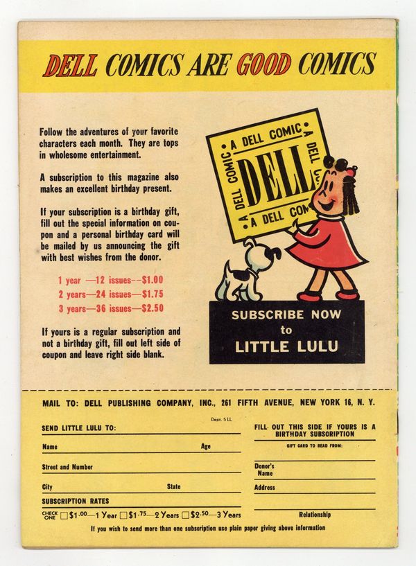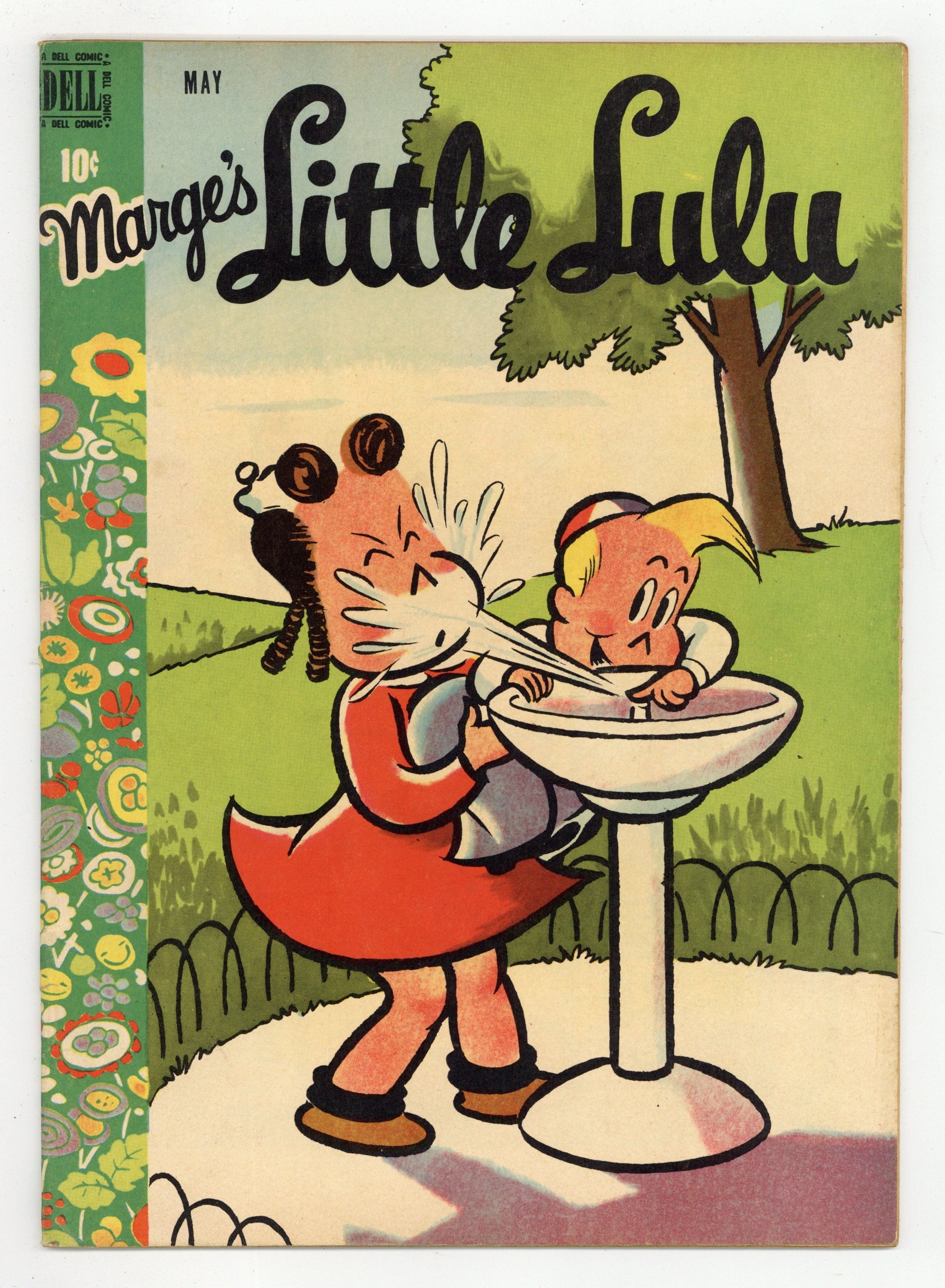 Cover art by John Stanley. Housekeeper Wanted; Lulu has to go through an initiation to join the Fellers' club. A Clothes Call; Lulu loses her pop's suit on the way to the dry cleaner's. The Prince In the Pool; Lulu tells Alvin about a monster living at the bottom of a deep pool. Tubby's Uncle; Tubby is embarrassed to be taking his mother's dress dummy across town. 36 pages, full color. Cover price $0.10.