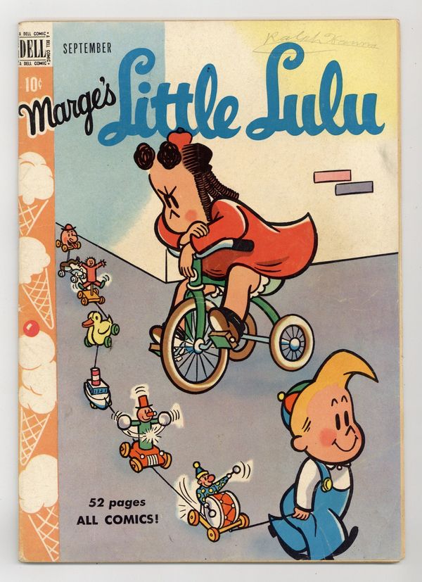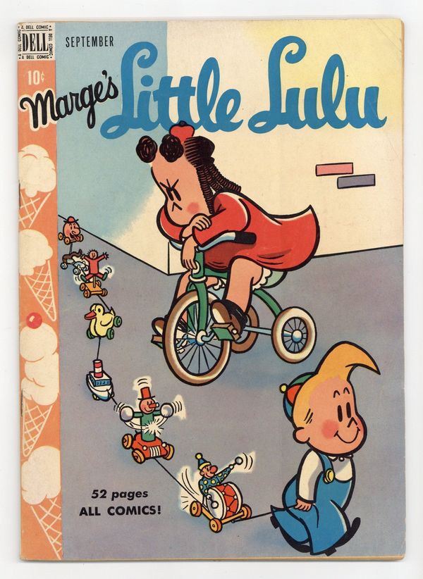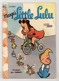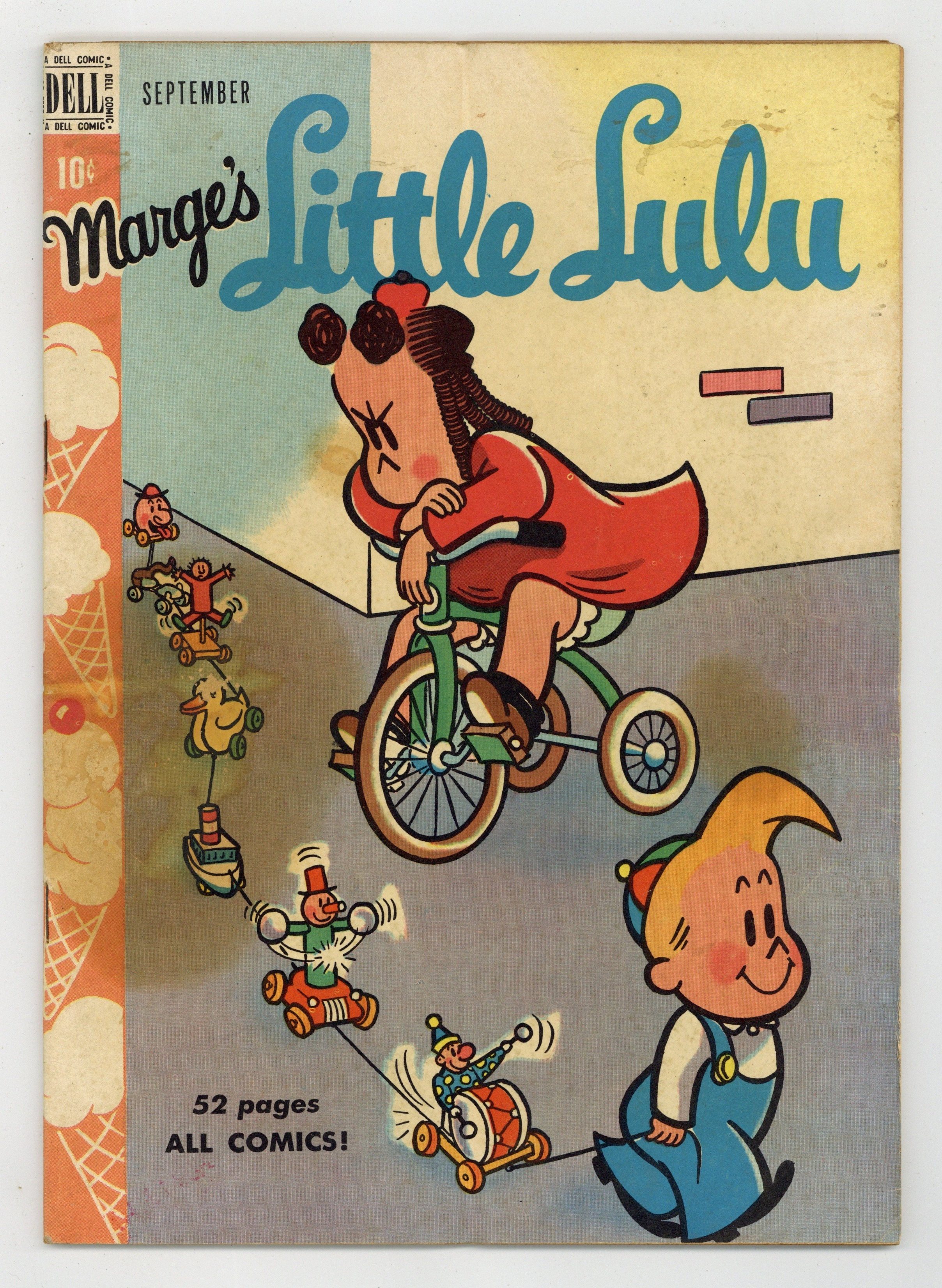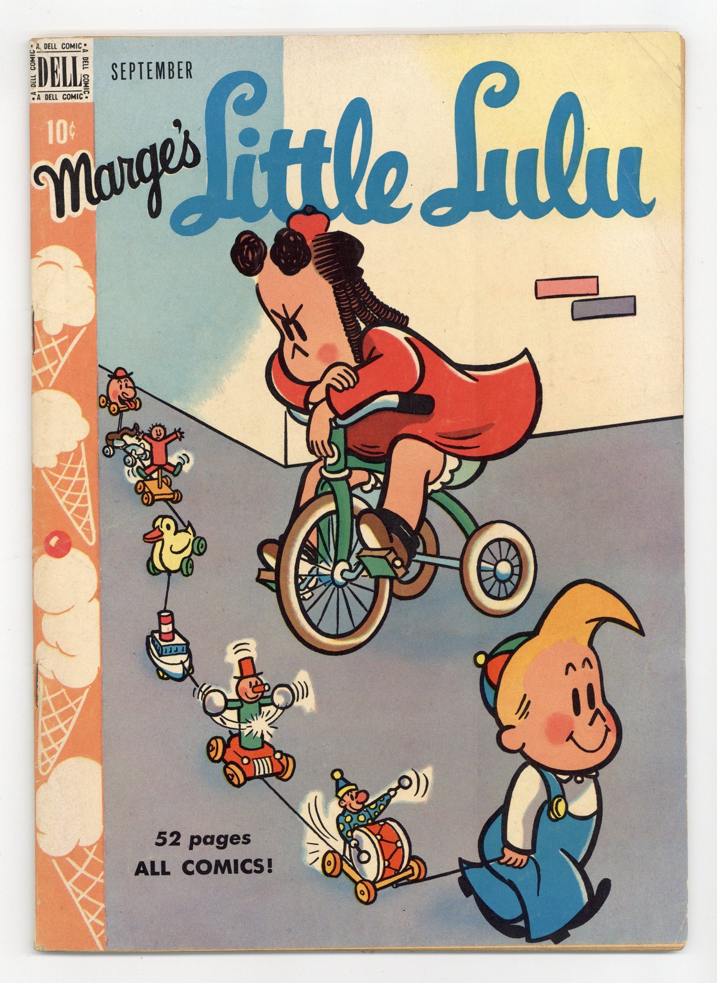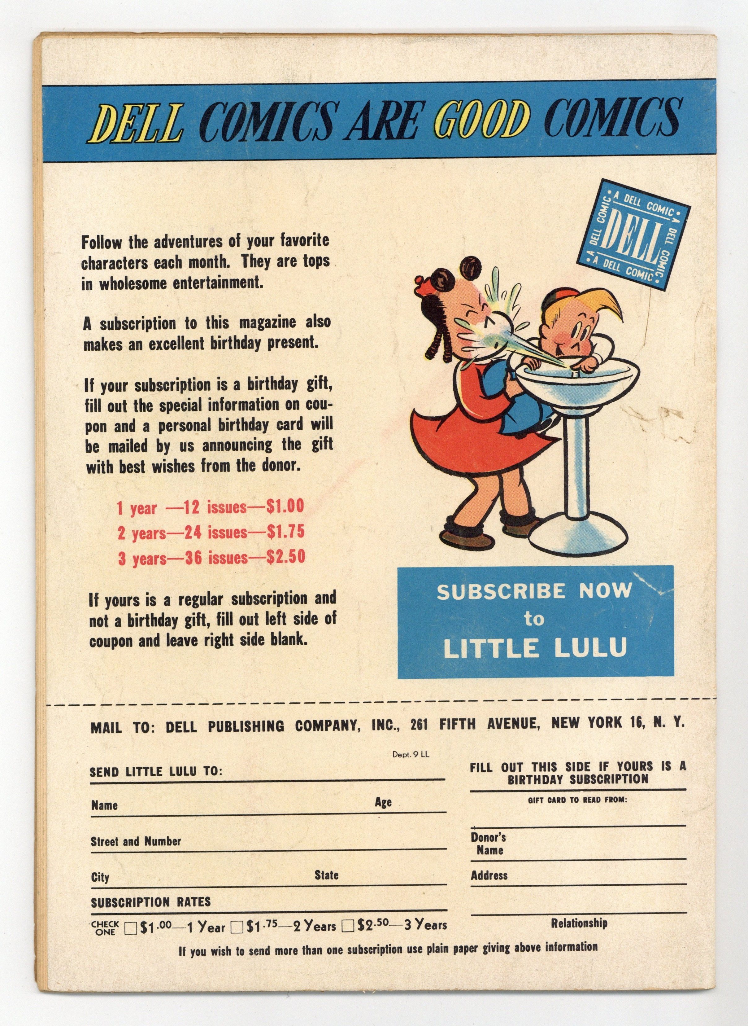 Cover art by Irving Tripp. Untitled story; Lulu wants to bring Tubby a present while he is sick in bed, but he wants the money instead. Untitled story; Lulu finds a ghost in her bedroom who needs to find a home. The Case of the Missing Wig; Tubby goes into disguise to solve the mystery of Lulu's missing doll wig. Untitled story; Lulu tells Alvin about the magic carpet she once owned. Untitled story; Tubby thinks the rock he has found in the woods is gold. All scripts by John Stanley, art by Irving Tripp. Two-page text story, Lulus Diry ("Diary"). 52 pages, full color. Cover price $0.10.