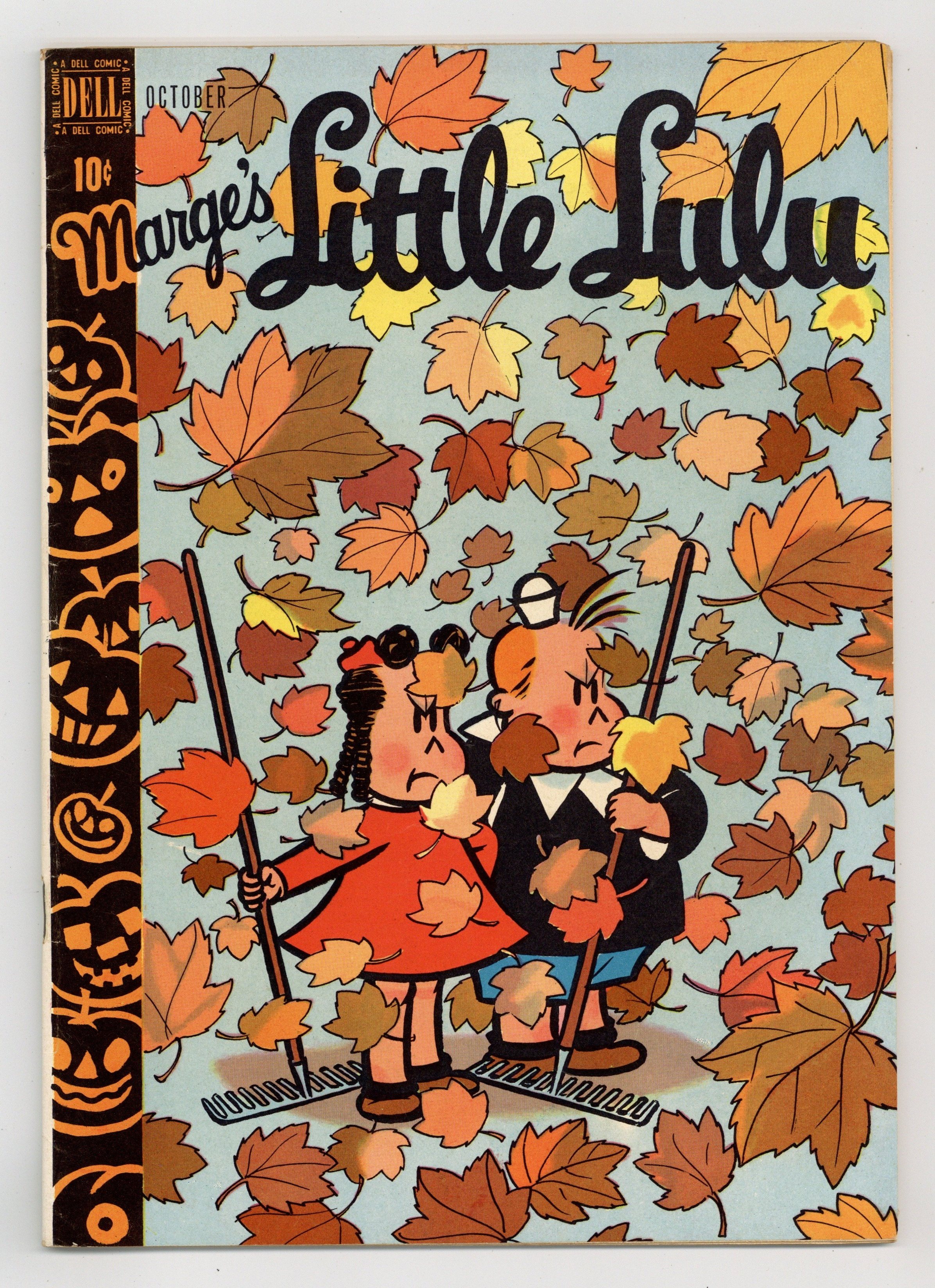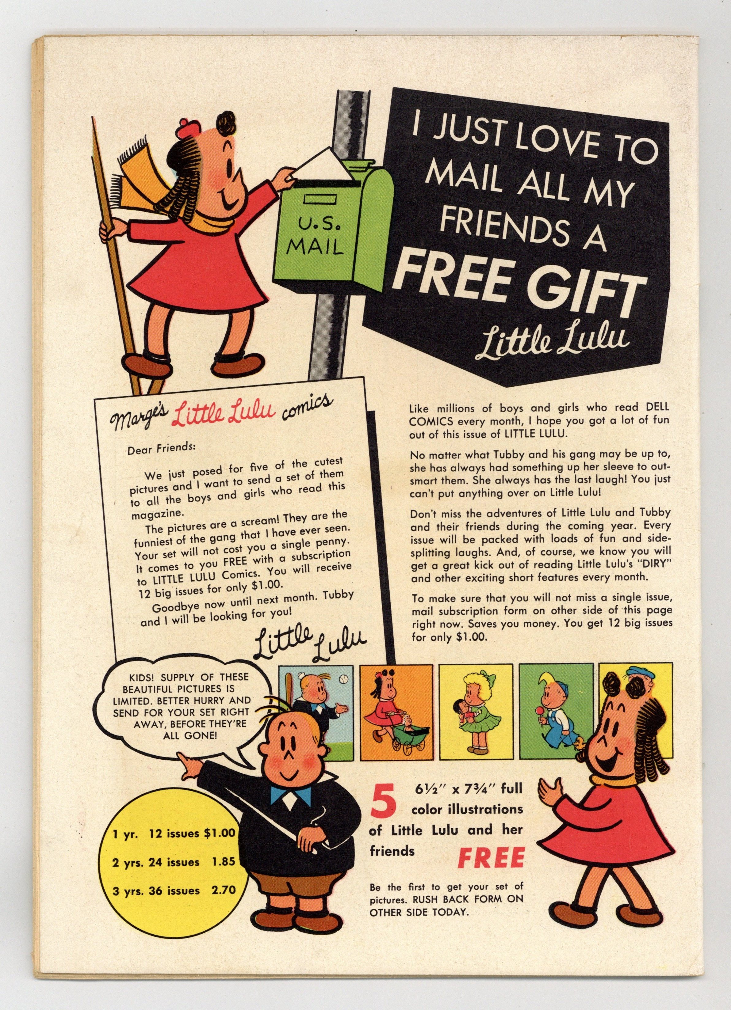 Cover art by Irving Tripp. Untitled story; Lulu has a plan to keep Gloria from winning the Fellers' neighborhood beauty contest. Untitled story; A rich boy plays tricks on Lulu at his mansion. Untitled story; Lulu is trampled by hordes of women at a department store sale. Untitled story; Lulu tells Alvin about a mermaid that was captured for a freak show. Untitled story; Tubby does not want to share his ice cream with the Fellers. All scripts by John Stanley, art by Irving Tripp. Two-page text story, Lulus Diry ("Diary"). Back cover has advertisement for five color Little Lulu pinups. 52 pages, full color. Cover price $0.10.