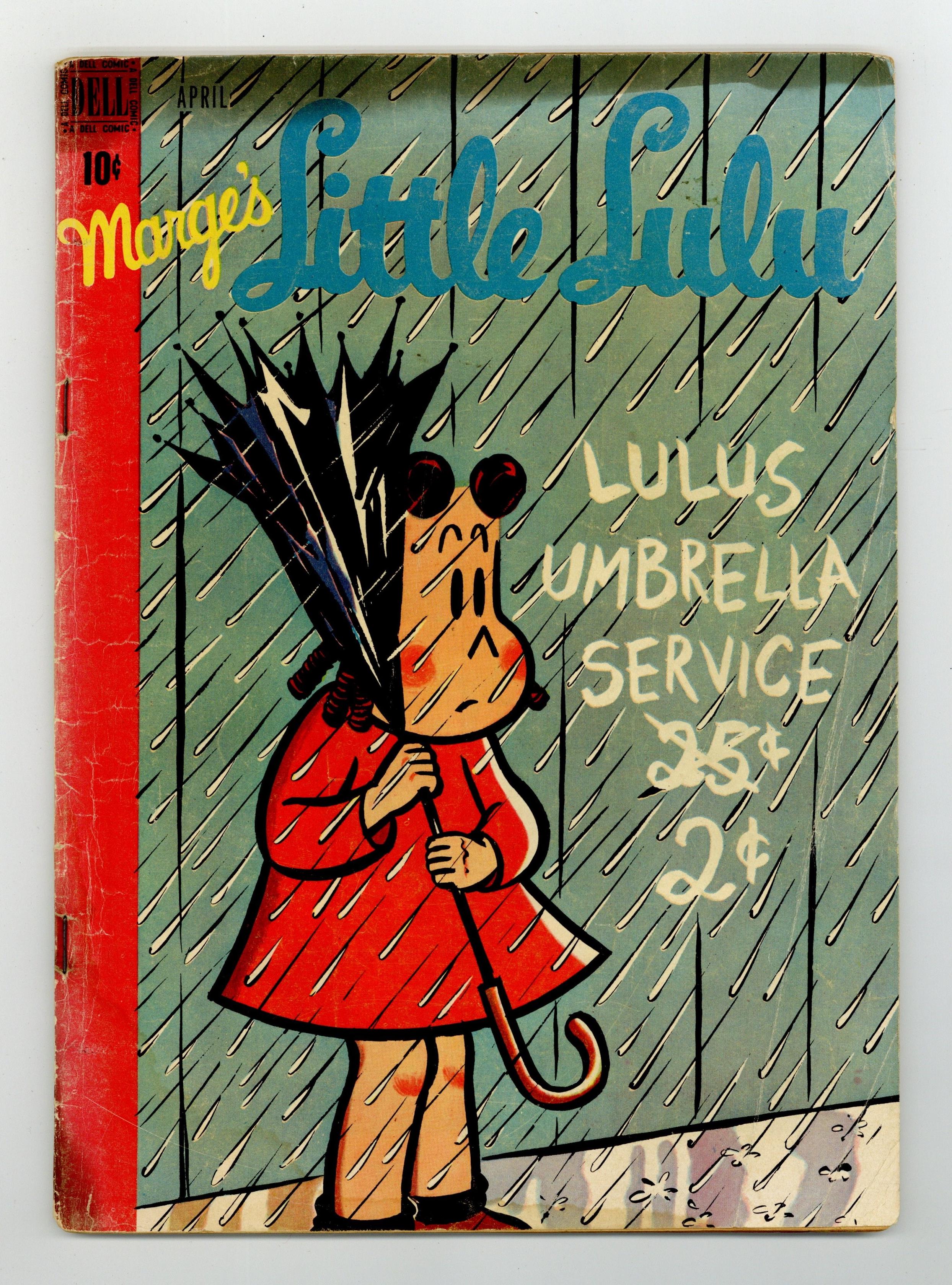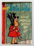 Cover art by John Stanley. Alvinsitting; Lulu is baby-sitting for Alvin and he locks her out of the house. Haunted Delivery; Tubby makes a drugstore delivery to a house of ghosts. Lulu's Umbrella Service; Wilbur hires Lulu to take him home under her umbrella. The Unseen Enemy; Tubby is scared when he gets an anonymous threatening phone call. North Pole; Lulu tells Alvin about when she discovered the North Pole. All scripts by John Stanley, art by Irving Tripp. Two-page text story, Lulus Diry ("Diary"). Back cover has advertisement for five color Little Lulu pinups. 52 pages, full color. Cover price $0.10.
