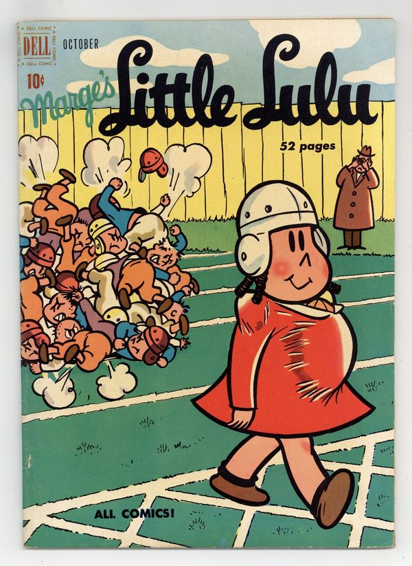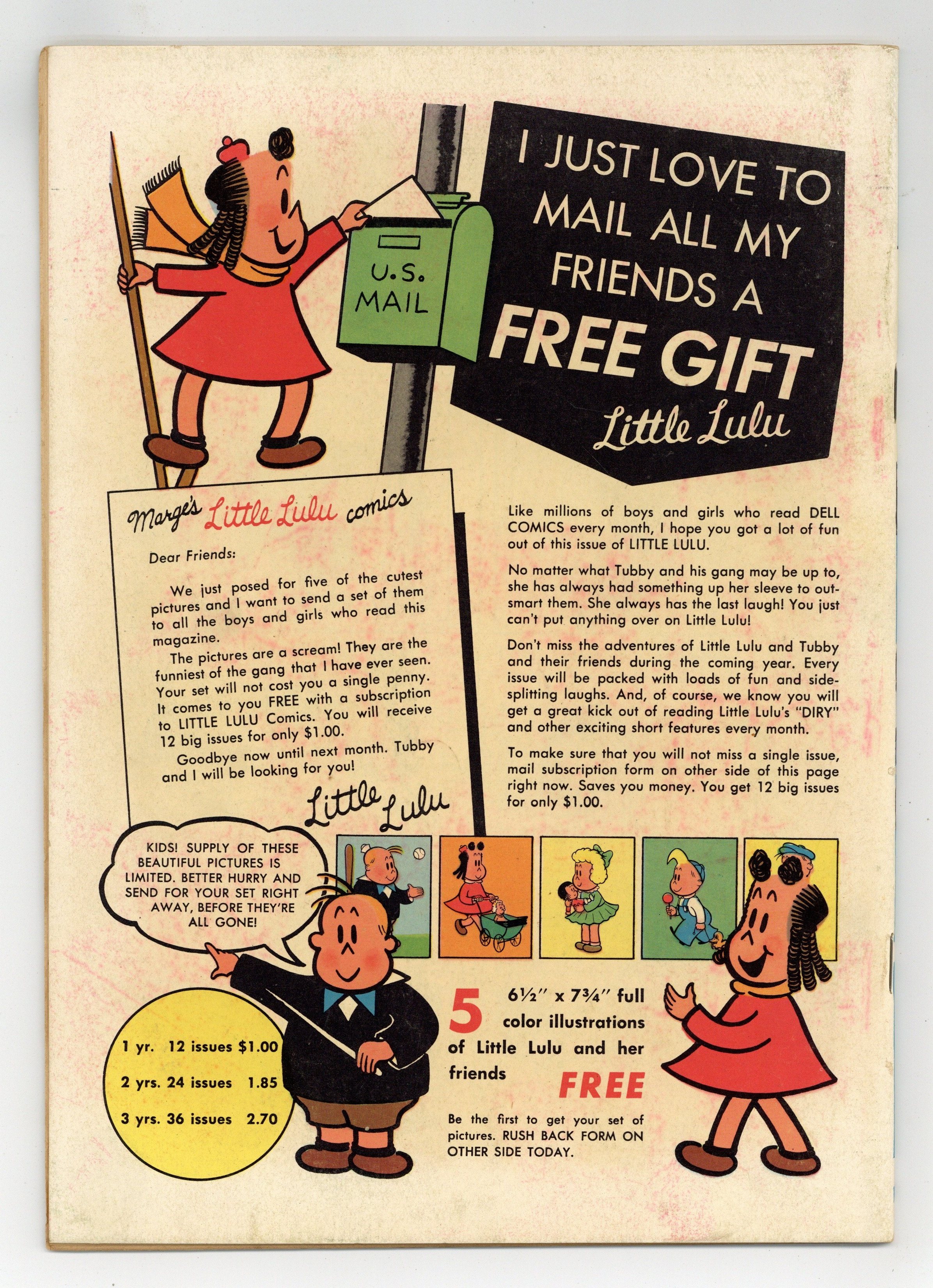 Published Oct 1950 by Dell/Gold Key.$33.00Cover art by Irving Tripp. Untitled Little Lulu story; Lulu disguises herself as a boy to try to keep the boys from playing hooky. Untitled Little Lulu story; Lulu's pop pays Lulu to try to get Alvin to break his noisy record. Gazo the Hypnotist; Lulu thinks she has hypnotized Tubby into giving her an ice cream cone. Shirley the Shadow; Lulu tells Alvin about the little girl who lost her shadow. Untitled Tubby story; Tubby's model airplane flies out the window and into a counterfeiters' apartment. The Hat; Lulu wears her mother's new hat outside and Wilbur's dog eats it. All scripts by John Stanley, art by Irving Tripp. Two-page text story, Lulus Diry ("Diary"). Back cover has advertisement for five color Little Lulu pinups. 52 pages, full color. Cover price $0.10.