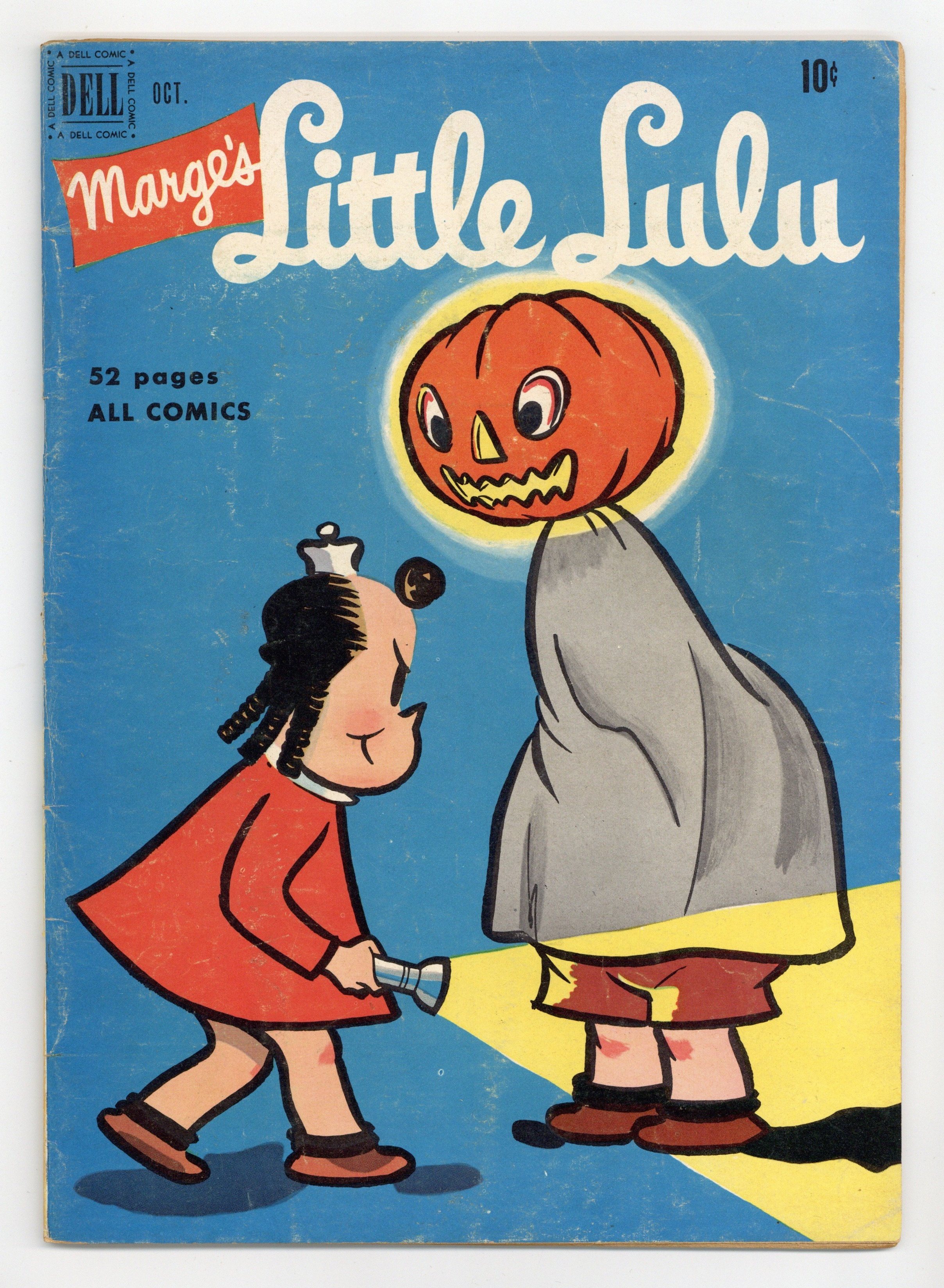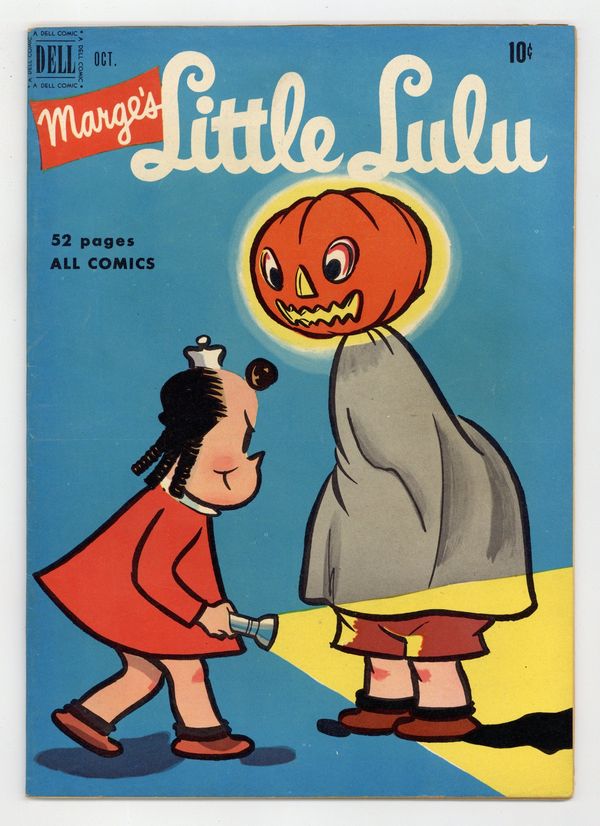 Published Oct 1951 by Dell/Gold Key.$29.00Cover art by Irving Tripp. The Pet Duck; Lulu learns that the duck that followed her home from the pond is circus trained and valuable. That Awful Mr. Googins; Lulu is picking up Miss Feeny's glasses at her home and is chased by the truant officer. The Little Rich Boy; Lulu tells Alvin about the richest boy in the world. The Salesman; Tubby goes into business selling toy mechanical men. All scripts by John Stanley, art by Irving Tripp. Two-page text story, Lulus Diry ("Diary"). Back cover has advertisement for five color Little Lulu pinups and Dell Comics Club. 52 pages, full color. Cover price $0.10.