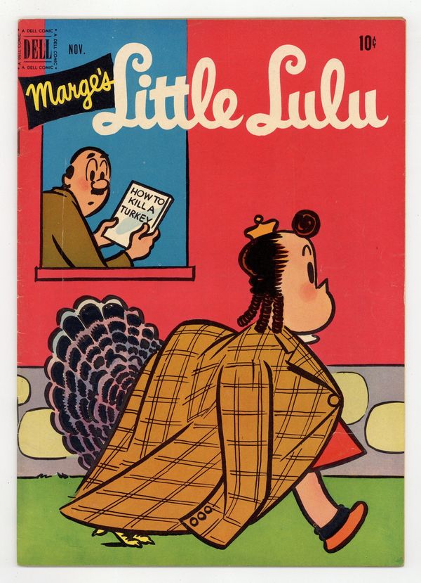 Published Nov 1951 by Dell/Gold Key.$22.00Cover art by Irving Tripp. Gertie Greenbean; A new girl in the neighborhood who lives in a trailer beats up Wilbur. All Dressed Up; Lulu tells Alvin about a little girl who disguised herself as a department store dummy. The Million-Dollar Note; Tubby hits a note on his violin that curls hair. All scripts by John Stanley, art by Irving Tripp. 36 pages, full color. Cover price $0.10.