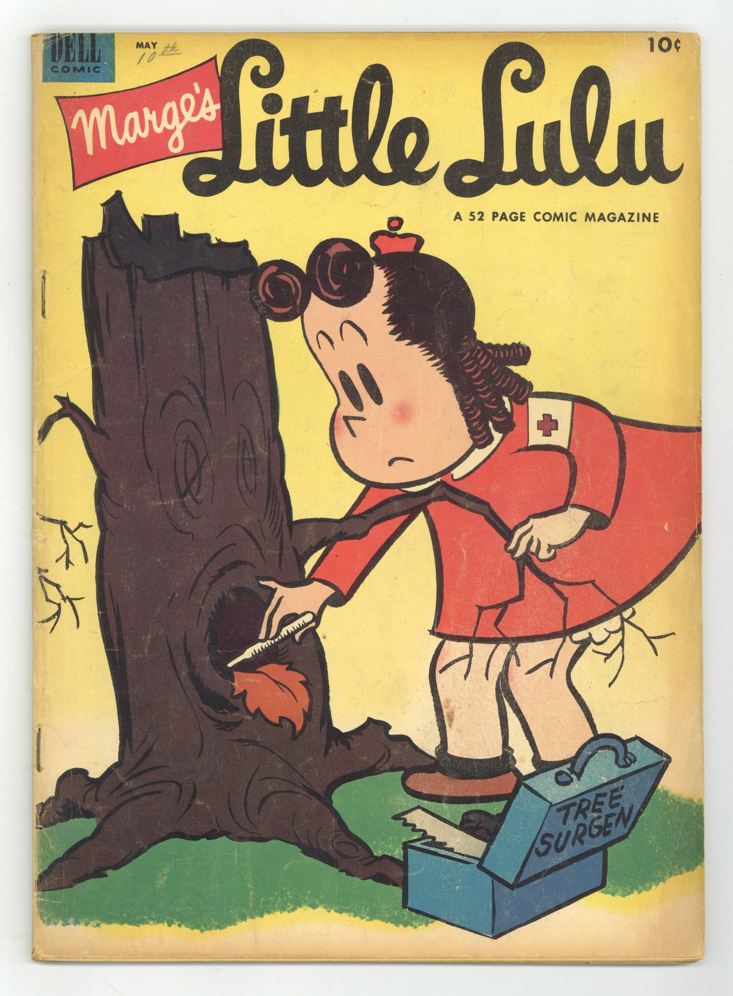 Published May 1953 by Dell/Gold Key.$24.00The Fright Racket; The Fellers tell Lulu she can join the club if she goes into Carson's haunted house at night. Sawdust Trail; Lulu keeps rescuing the cat Tubby and Willy are trying to lose. The Comedian; Tubby wants to hit Lulu in the face with a sour custard pie. The Outing; Lulu wakes Tubby up after she is locked out of her house in the middle of the night. Cuffed Customer; Lulu finds out why Tubby has a pair of handcuffs in his shoeshine box. Luluson Crusoe; Lulu tells Alvin about a little girl who was cast up on a desert island. The Manhunter; Tubby is looking all over town for a robber named Barry Burgle. Two-page text story, Lulus Diry ("Diary"). 52 pages, full color. Cover price $0.10.