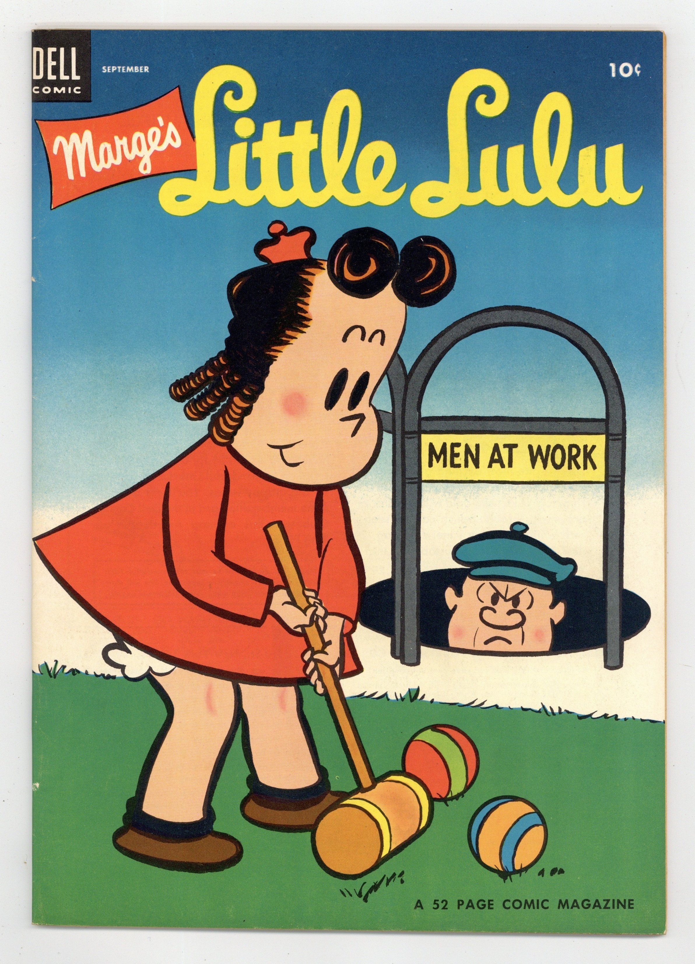 Published Sep 1953 by Dell/Gold Key.$23.00The Tea Party; Lulu ties Tubby up and takes him to a tea party against his will. The Substitute; Mr. McNabbem disguises himself as a nursemaid to try to capture Lulu. The Case of the Escaped Convict; Tubby uses a bloodhound to track down Lulu's missing pop. The Bill Collector; Tubby has trouble collecting newspaper money from a customer. Cops an' Robbers; Lulu has a very hard time protecting her dozen doughnuts from the boys. That Ol' Witch Hazel and the Little Mermaid; Lulu tells Alvin about the girl Hazel turned into a mermaid. Cousin Chubby; Tubby takes his look-alike younger cousin Chubby out and tries to get rid of him. Two-page text story, Lulus Diry ("Diary"). 52 pages, full color. Cover price $0.10.