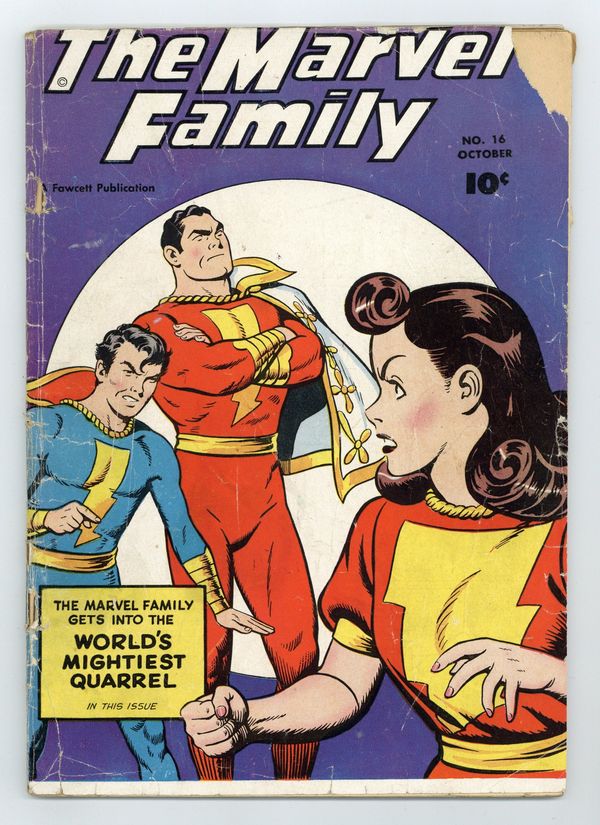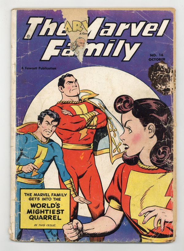 Stories and art by C. C. Beck, Howard Boughner, and Kurt Schaffenberger. Fawcett's most popular heroes, the original Captain Marvel (Shazam) and family, in solo and shared adventures. When the Sivana family is slighted by a society function, Sivana plots revenge on the Marvels with a formula that makes them belligerent to each other. Mary Marvel encounters an enchanted gingerbread man who has been sent to Earth by a fairy's spell, and dreams of turning into a real man. Aliens abduct Captain Marvel and force him into gladiatorial combat with the mightiest beings from other planets. Plus a plethora of vintage comics-format ads, including a hair-cream ad featuring detective Sam Spade, and a Tootsie Roll ad, Captain Tootsie and the Radar Rescue, with art by Shazam co-creator CC Beck. The Marvel Family Has a Quarrel; Judge Smudge; Lazy Lee; Peewee Pete Goes Nuts; Whipper-Snappers; Captain Marvel Jr.: The Scroll of Death; Mary Marvel: The Gingerbread Man (A Modern Fable); Big Mike Donlan; Captain Marvel: Mightiest Mortal of the Universe. 48 pages, Full Color. Cover price $0.10.