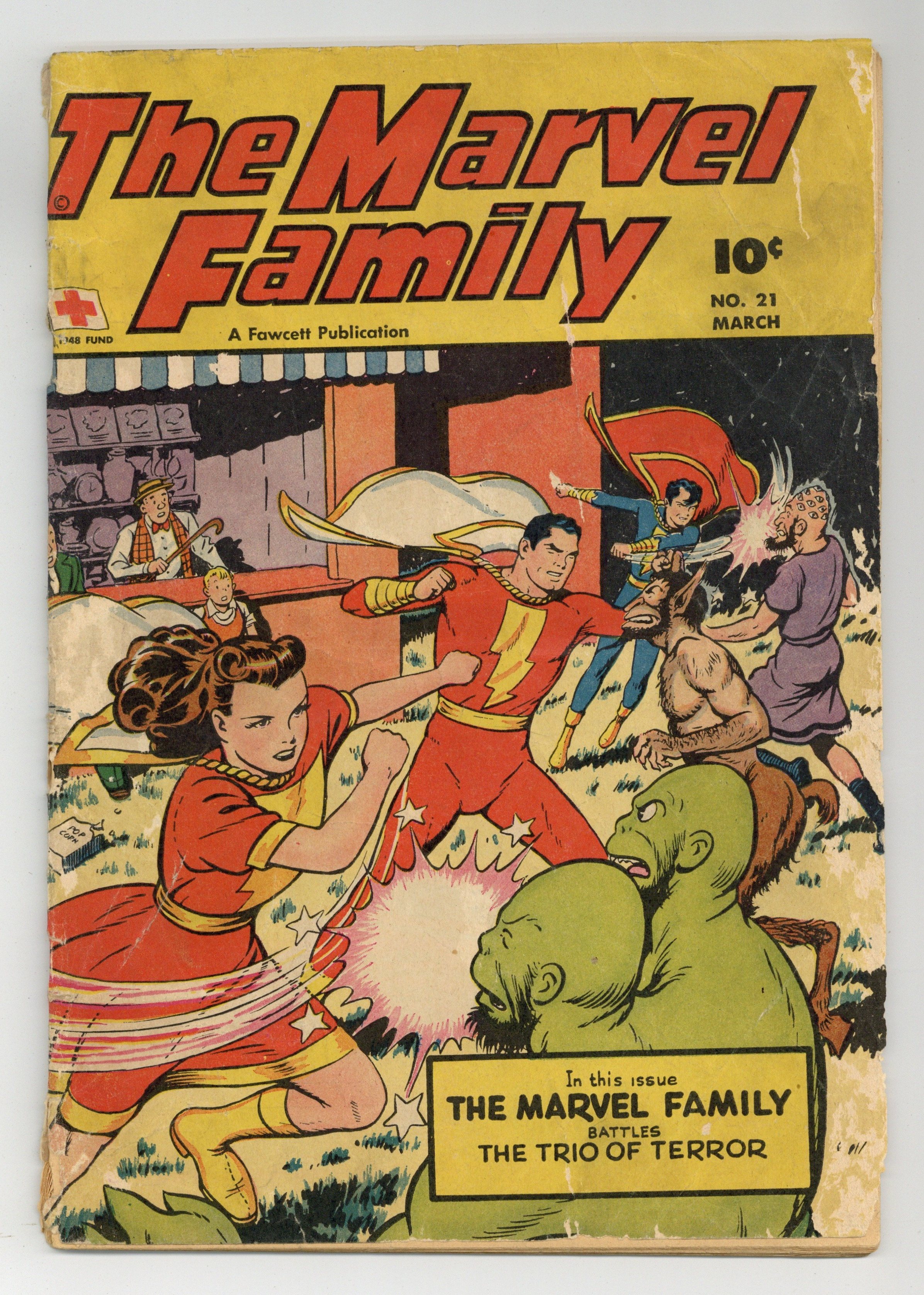 Stories and art by Otto Binder, C. C. Beck, Kurt Schaffenberger, Pete Costanza, and Howard Boughner. Fawcett's most popular heroes, the original Captain Marvel (Shazam) and family, in solo and shared adventures. When circus entrepreneurs fail to get the Marvels to appear in their show, they accidentally summon three demons instead. Mary Marvel investigates when songwriters' new songs are somehow stolen by a record company before they're even written down. Sivana tricks the original Captain Marvel into smashing open buildings that he wants to rob, by disguising himself as an Einstein-like scientist. The Trio of Terror; Judge Smudge; Lazy Lee; Peewee Pete; Mary Marvel: Tune Trouble; Kanvasback; Captain Marvel, Jr.: The Flying Eye; Easy as Taking Candy From a Baby; The Space Race; Captain Marvel: The Science Crimes. 48 pages, Full Color. Cover price $0.10.