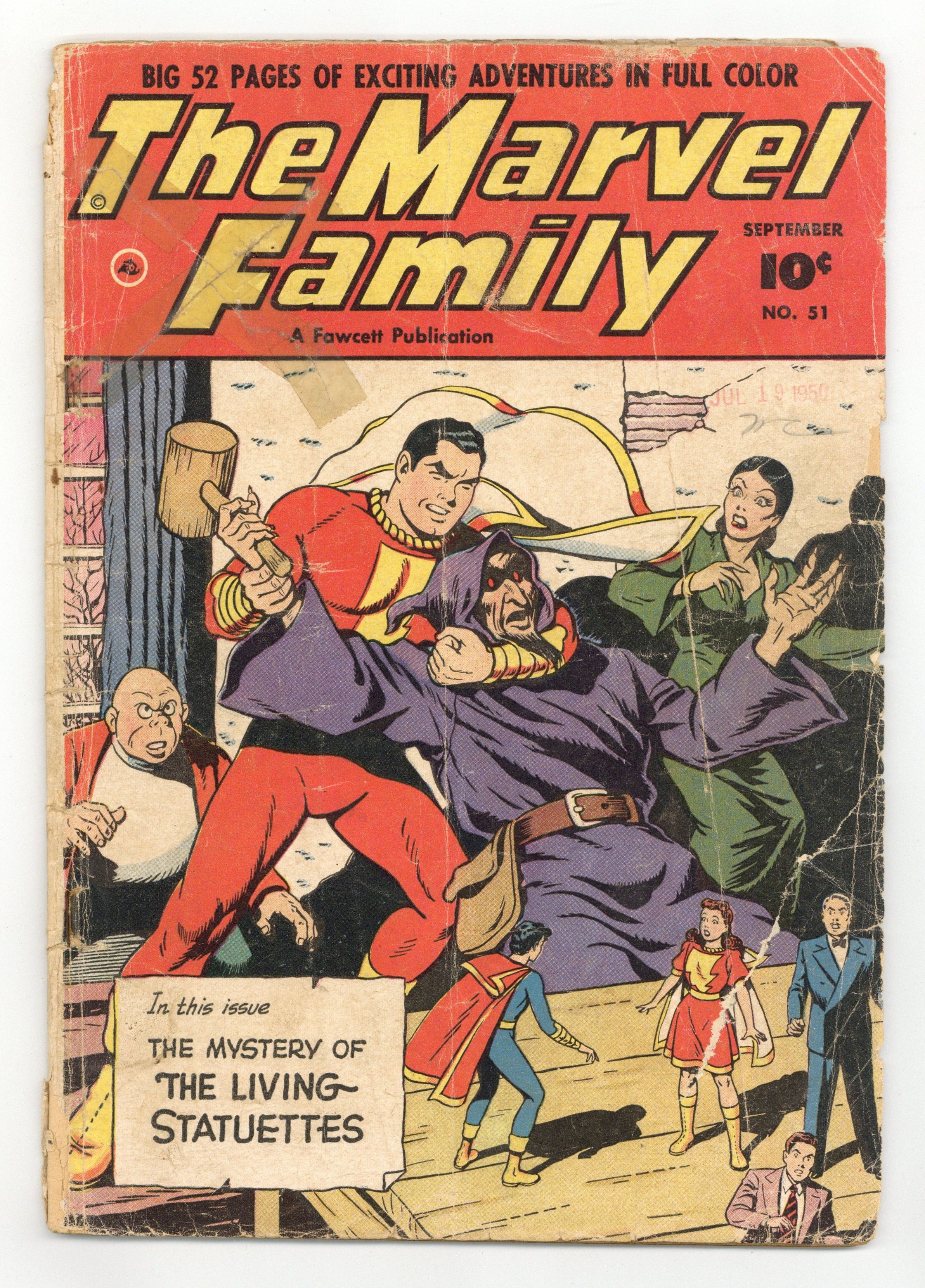 Cover by Pete Costanza. Stories and art by Otto Binder, C. C. Beck, Pete Costanza, Kurt Schaffenberger, and Howard Boughner. Fawcett's most popular heroes, the original Captain Marvel (Shazam) and family, in solo and shared adventures. The Marvel Family faces the mystical menace of Madame Bella Donna and Black Wizard, and the Mystery of the Living Statuettes. Captain Marvel, Jr. investigates when a mad scientist's "Hair Blight" causes everyone in the city to go bald, resulting in a rush on wigs and toupees. Captain Marvel explores a newly-discovered square world (not the Bizarro World), and is mistaken for the only other human on the planet, a criminal. Capt. Marvel Jr.: The Baldness Plague; Mary Marvel Chases the Will OWisp; Handy Weapon; Luke and Fluke; Boxcar Benny; Lazy Lee; The Marvel Family Puzzle Page; Headline Harry: The Mad Scientist; Captain Marvel: The Mystery of the Square World; Woods the Woodsman. 48 pages, Full Color. Cover price $0.10.