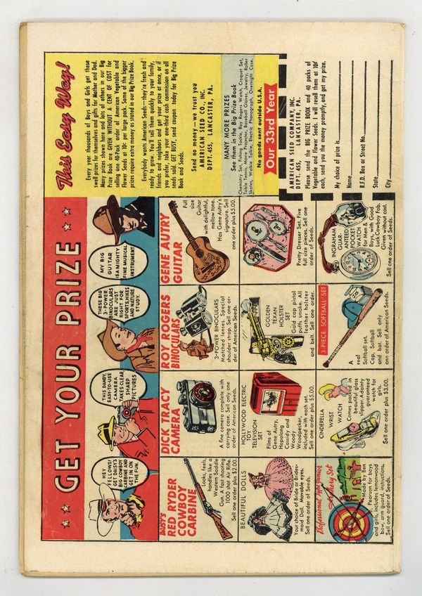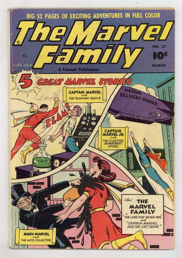 Cover by C. C. Beck and Pete Costanza. Stories and art by Otto Binder, Kurt Schaffenberger, Pete Costanza, Pete Riss, and Howard Boughner. Fawcett's most popular heroes, the original Captain Marvel (Shazam) and family, in solo and shared adventures. When the people of a crowded land fear the bandits of the nearby mountains, The Marvel Family solves both problems at once by simply getting rid of the mountains. The original Captain Marvel loses his sense of taste, and sets out to find who or what is responsible. Mary Marvel meets a man who loves hate mail and does terrible things just to get more hate, a sort of predictor of future social-media phenomena. The Land That Never Was; Capt. Marvel: The Mystery of the Lost Sense; Boxcar Benny; Lazy Lee; The Marvel Family Puzzle Page; Headline Harry: Firing Escape; Mary Marvel: The Collector of Hate; As Thousands Jeer; Capt. Marvel Jr.: The Floating Department Store; Captain Marvel: The Runaway Genius. 48 pages, Full Color. Cover price $0.10.